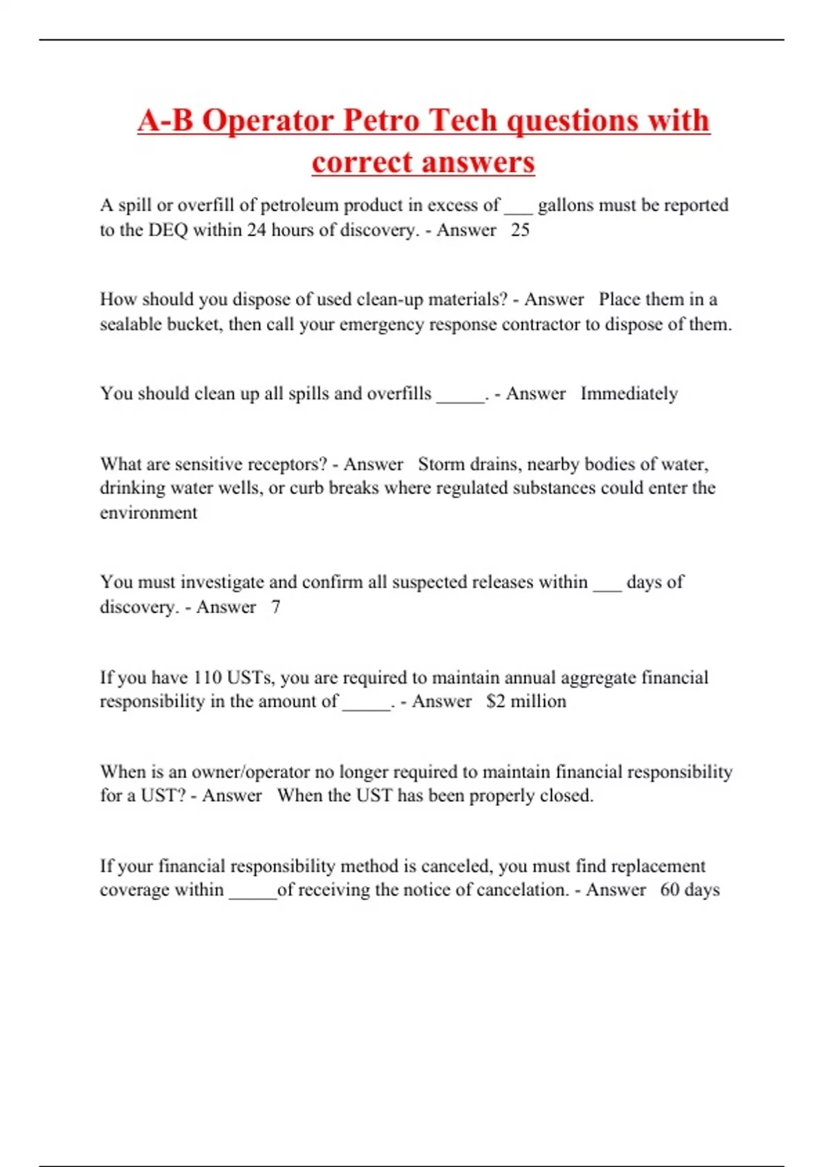 A spill or overfill of petroleum product in excess of ___ gallons must be reported to the DEQ within 24 hours of discovery. - Answer 25 How should you dispose of used clean-up materials? - Answer Place them in a sealable bucket, then call your emergency response contractor to dispose of them. You should clean up all spills and overfills _____. - Answer Immediately What are sensitive receptors? - Answer Storm drains, nearby bodies of water, drinking water wells, or curb breaks where regulated substances could enter the environment You must investigate and confirm all suspected releases within ___ days of discovery. - Answer 7 If you have 110 USTs, you are required to maintain annual aggregate financial responsibility in the amount of _____. - Answer $2 million When is an owner/operator no longer required to maintain financial responsibility for a UST? - Answer When the UST has been properly closed. If your financial responsibility method is canceled, you must find replacement coverage within _____of receiving the notice of cancelation. - Answer 60 days An owner/operator must submit a completed Notification