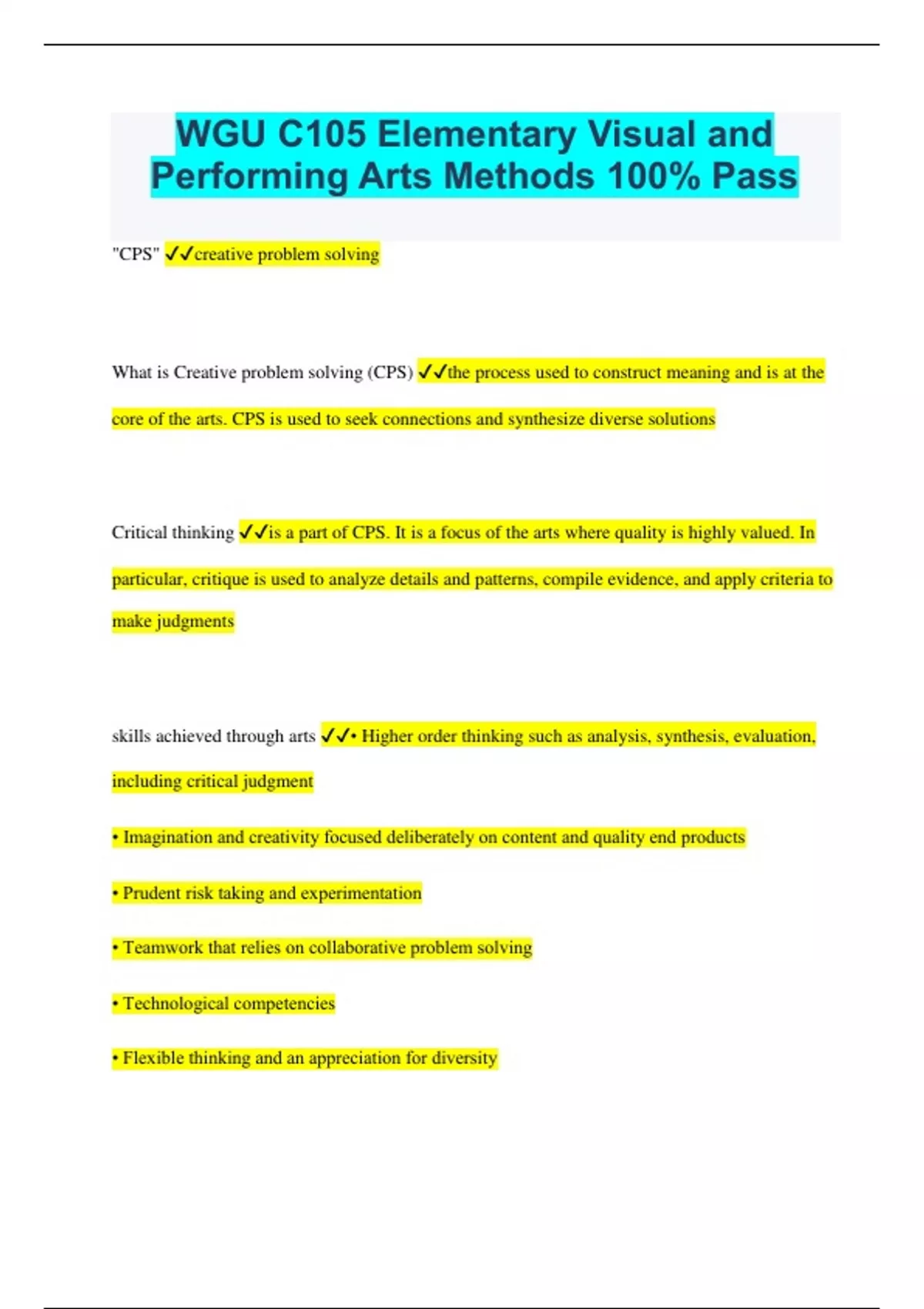 WGU C105 Elementary Visual and Performing Arts Methods 100% Pass "CPS" creative problem solving What is Creative problem solving (CPS) the process used to construct meaning and is at the core of the arts. CPS is used to seek connections and synthesize diverse solutions Critical thinking is a part of CPS. It is a focus of the arts where quality is highly valued. In particular, critique is used to analyze details and patterns, compile evidence, and apply criteria to make judgments skills achieved through arts • Higher order thinking such as analysis, synthesis, evaluation, including critical judgment • Imagination and creativity focused deliberately on content and quality end products • Prudent risk taking and experimentation • Teamwork that relies on collaborative problem solving • Technological competencies • Flexible thinking and an appreciation for diversity • Self-discipline, persistence, and taking initiative integrate reading to visual arts *Artwork is "read" in a way similar to reading word-based print text. *The reader/viewer must first perceive the work as a whole and then relate subordinate parts to discover relationships and connections, along with important emphases. *Making sense of any painting, sculpture, or artwork requires coordinated use of higher order thinking skills (CPS), in the same way CPS is used to understand traditional texts integrate reading to drama/theater arts Comprehension of dramatic texts closely parallels thinking to understand any written work and performance is largely about interpretation of words using CPS. Actors usually do a first read to derive big ideas in a script, which entails visualizing the setting. They also zero in other literary elements to create meaning, especially the conflict or problem, which sets the plot in motion (rising and falling action, crisis, and climax). Actors read to analyze their characters' motives and relationships to other characters and the plot integrate reading to dance Viewing a dance involves nearly the same comprehension strategies to those used in reading traditional texts, that is, coordinated CPS thinking. Dance compositions are created about the same themes and big ideas that are at the core of the literary arts, again using CPS integrate reading to music Reading a piece of music is virtually identical to reading print text and includes decoding symbols for the purpose of making sense. Reading music notation requires reading ahead, determining phrases and the overall structure, locating accents, interpreting symbols and verbal indicators, and discriminating