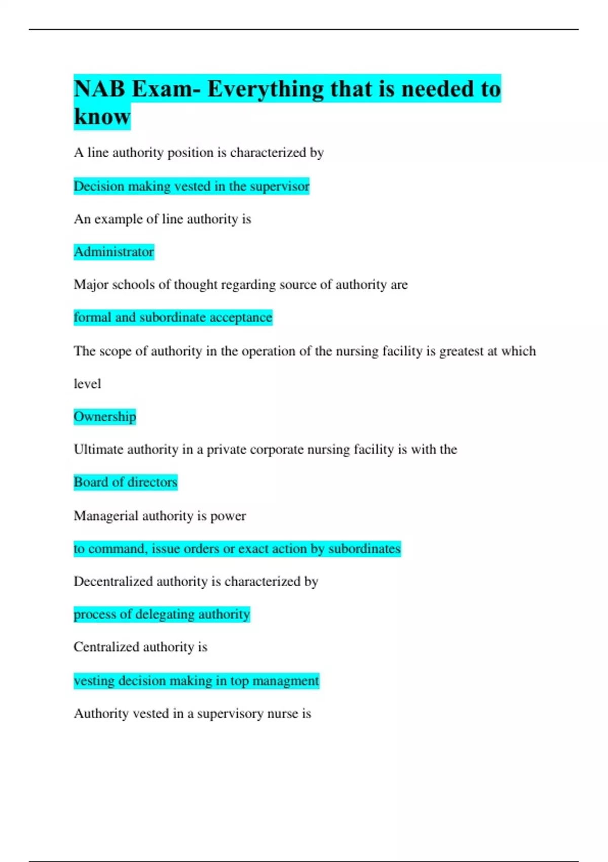 NAB Exam- Everything that is needed to know NAB Exam- Everything that is needed to know A line authority position is characterized by Decision making vested in the supervisor An example of line authority is Administrator Major schools of thought regarding source of authority are formal and subordinate acceptance The scope of authority in the operation of the nursing facility is greatest at which level Ownership Ultimate authority in a private corporate nursing facility is with the Board of directors Managerial authority is power to command, issue orders or exact action by subordinates Decentralized authority is characterized by process of delegating authority Centralized authority is vesting decision making in top managment Authority vested in a supervisory nurse is middle management authority Decision making authority is when a supervisor hires, fires and makes judgmental decisions Concepts of modern management recommend that an effective administrator will delegate operational authority Unity of command refers to reporting to one supervisor Which of the following forms of business is considered the oldest form of business sole proprietorship The term proprietorship as it relates to the nursing facility industry means privately owned The majority of nursing facility beds in the united states are owned by corporations Which of the following forms of ownership must have articles drawn up and reduced to writing? corporation Under which form of ownership would the administrator have the greatest latitude of authority and decision making? Sole proprietorship All but one are considered advantages of sole proprietorship Unlimited liability All but one are considered disadvantages of a partnership Retention of valuable employees A corporation is a legal entity created by law to carry on a business or profession Which one of the following forms of business ownership is considered the most important? Corporation A nonprofit corporation is one which makes a profit but returns it to the operation of business Pursuant to the Code of Federal Regulations, 42 CFR part 483, a facility wishing to participate in medicare must have a governing body The role of the governing body pursuant to the Code of Federal Regulation 42 CFR Part 483 is to establish and implement policies regarding management and operation of the facility The Code of Federal Regulations 42 CFR part 483 requires that the facility disclose officers, directors, agents, or management employees The role of the administrator in a modern nursing facility is to advise the governing body and carry out their decisions According to the Code of Federal Regulations 42 CFR Part 483 the administrator appointed by the governing body must be licensed by the state and responsible for the management of the facility An objective may be defined as organizing The first step in planning is setting the objectives of the organization Effective management is best carried out by following which method? management by objectives Management by objectives involves plurality of objectives Which of the following objectives would be considered first in establishing a new nursing facility? Type of facility An administrator of a proprietary nursing facility should be primarily concerned with which one of the following objectives? Quality of care Which one of the functions of management would be accomplished first? planning Relative to setting objectives, which task listed below would be of primary importance for the administrator to accomplish? constantly review and reassess objectives of the nursing facility Which one of the following statements is true? Every department in the nursing facility should have goals or objectives Since there is a plurality of objectives in a nursing facility, the facility should concern itself with long and short term goals Planning is primarily concerned with use of facts to determine course of action for the future Strategic planning helps the facility to re evaluate its mission and identify its long term goals. Planning on a broad scale is carried on primarily by a administrator Planning involves all but one of the following personnel decisions Which of the following is not a function of the administrator? ultimate approval of all policies (governing board does that) Planning at the top level of management is best characterized as broad, far-reaching, and basic In the process of planning, which guideline should be followed? involve as many managers as possible Considering the functions of management such as: directing, organizing, coordination, controlling and planning, which of these functions would be first? planning The technique of forecasting is important in the modern nursing facility. The accuracy of the administrator's forecasts will affect the success of planning. Forecasts are expected to be a reasonable estimate of what reality will be in the future In the process of planning, the administrator should constantly check, recheck, and modify the plan if necessarry A short range plan covers which time period? 1-2 years A long range plan covers 3-5 years The function of management called organizing is best described as the process of grouping various activities of a similar nature and establishing authority relationships At which operational level in a nursing facility does organizing take place? at all dept levels within the organized structure The mission statement of a nursing facility explains the goals and objectives to the facility Span on management is the number of employees a supervisor can effectively handle The schematic drawing representing the functional operation of a nursing facility structure is called the organizational chart Service departments of a nursing facility can best be described as departments that facilitate, aid and assist other departments An example of a service department in a nursing facility is the personnel office Line authority structure is best described as a situation in which a superior delegat