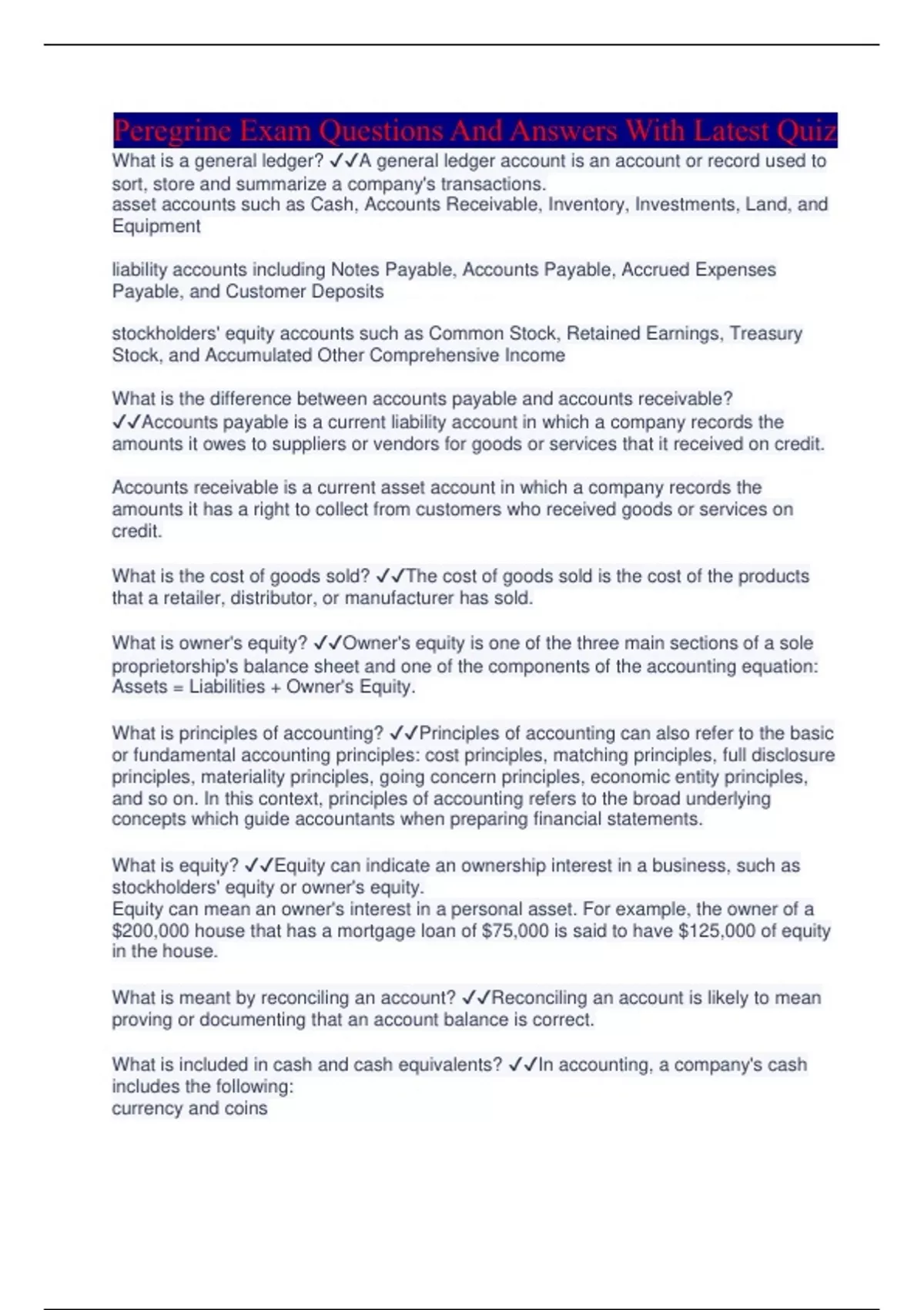 Peregrine Exam Questions And Answers With Latest Quiz What is a general ledger? A general ledger account is an account or record used to sort, store and summarize a company's transactions. asset accounts such as Cash, Accounts Receivable, Inventory, Investments, Land, and Equipment liability accounts including Notes Payable, Accounts Payable, Accrued Expenses Payable, and Customer Deposits stockholders' equity accounts such as Common Stock, Retained Earnings, Treasury Stock, and Accumulated Other Comprehensive Income