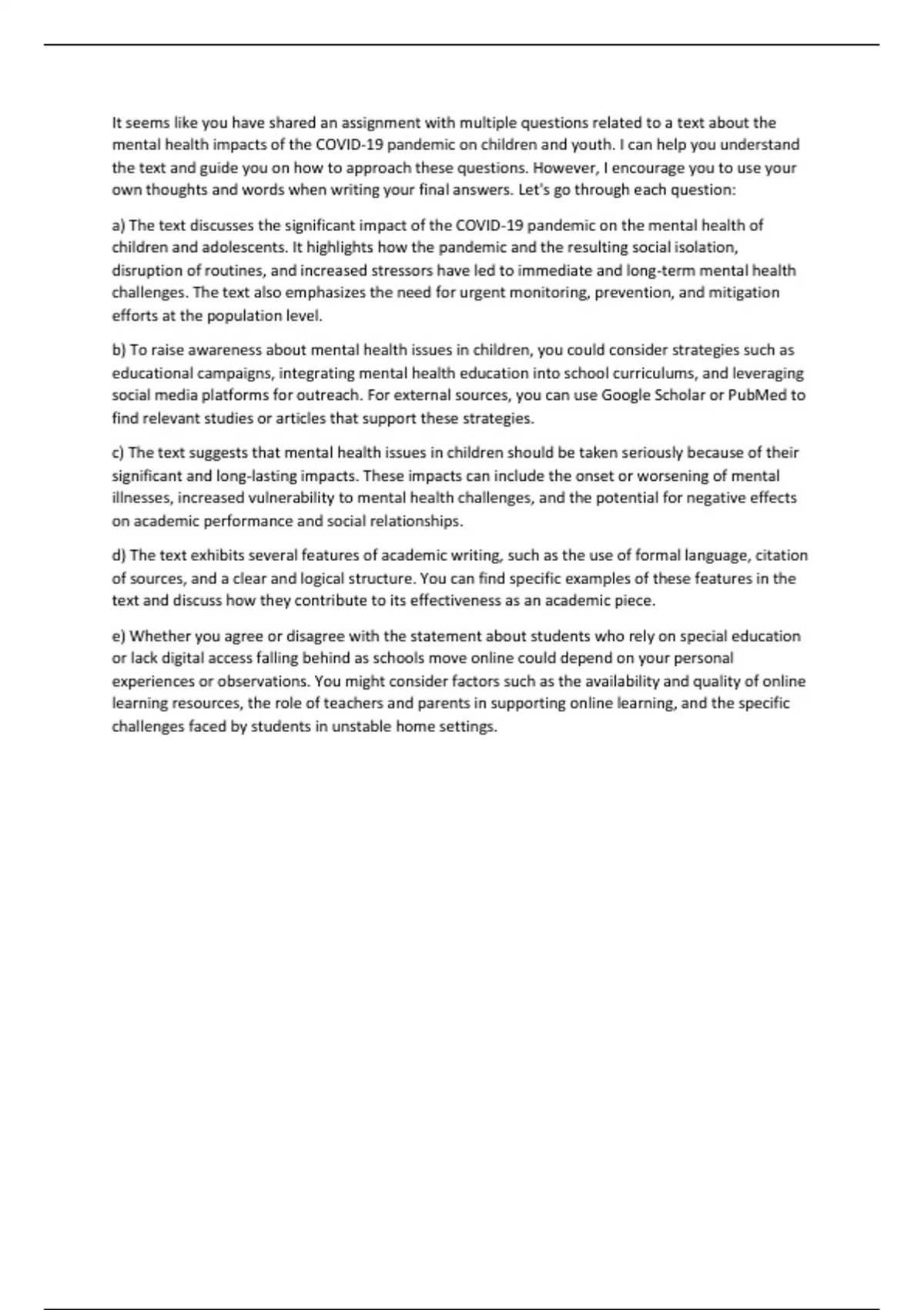 a) The text discusses the significant impact of the COVID-19 pandemic on the mental health of