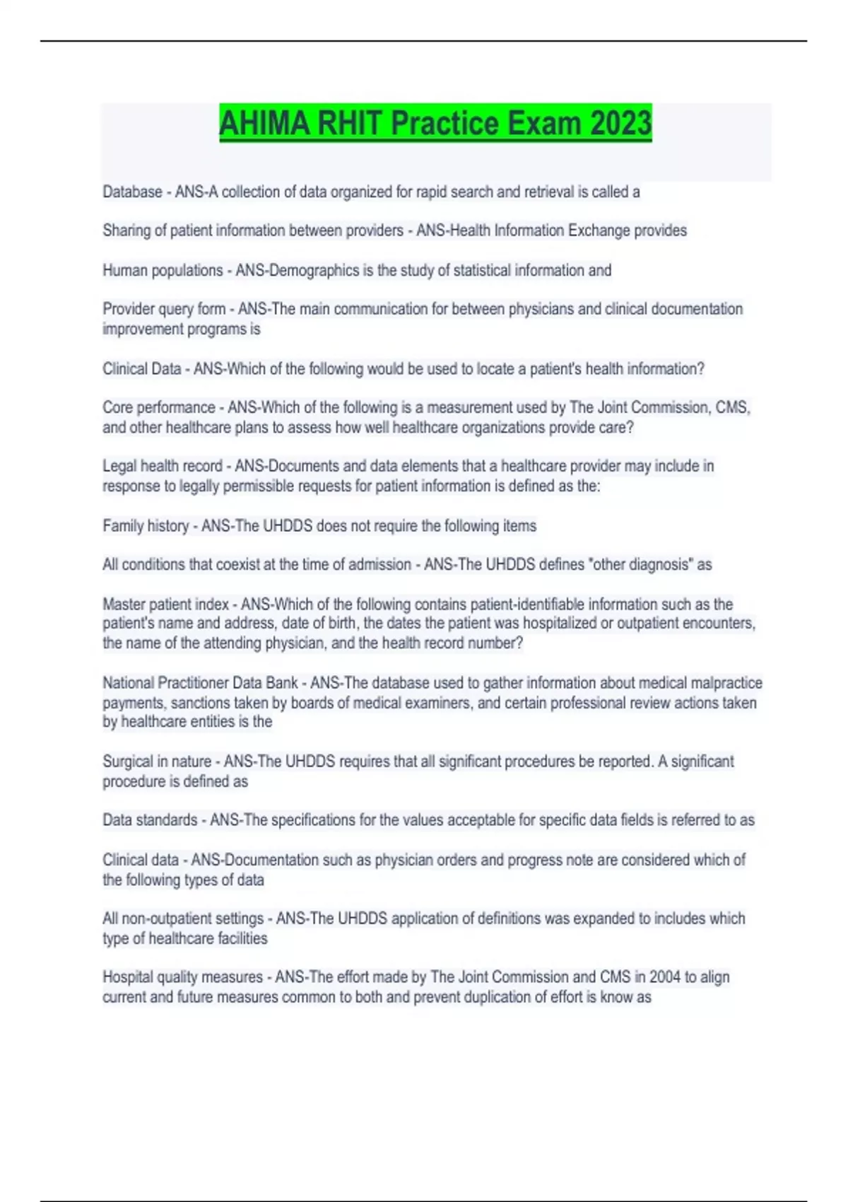 AHIMA RHIT Practice Exam 2023 Database - ANS-A collection of data organized for rapid search and retrieval is called a Sharing of patient information between providers - ANS-Health Information Exchange provides Human populations - ANS-Demographics is the study of statistical information and Provider query form - ANS-The main communication for between physicians and clinical documentation improvement programs is Clinical Data - ANS-Which of the following would be used to locate a patient's health information? Core performance - ANS-Which of the following is a measurement used by The Joint Commission, CMS, and other healthcare plans to assess how well healthcare organizations provide care? Legal health record - ANS-Documents and data elements that a healthcare provider may include in response to legally permissible requests for patient information is defined as the: Family history - ANS-The UHDDS does not require the following items All conditions that coexist at the time of admission - ANS-The UHDDS defines "other diagnosis" as Master patient index - ANS-Which of the following contains patient-identifiable information such as the patient's name and address, date of birth, the dates the patient was hospitalized or outpatient encounters, the name of the attending physician, and the health record number? National Practitioner Data Bank - ANS-The database used to gather information about medical malpractice payments, sanctions taken by boards of medical examiners, and certain professional review actions taken by healthcare entities is the Surgical in nature - ANS-The UHDDS requires that all significant procedures be reported. A significant procedure is defined as Data standards - ANS-The specifications for the values acceptable for specific data fields is referred to as Clinical data - ANS-Documentation such as physician orders and progress note are considered which of the following types of data All non-outpatient settings - ANS-The UHDDS application of definitions was expanded to includes which type of healthcare facilities Hospital quality measures - ANS-The effort made by The Joint Commission and CMS in 2004 to align current and future measures common to both and prevent duplication of effort is know as Continues...