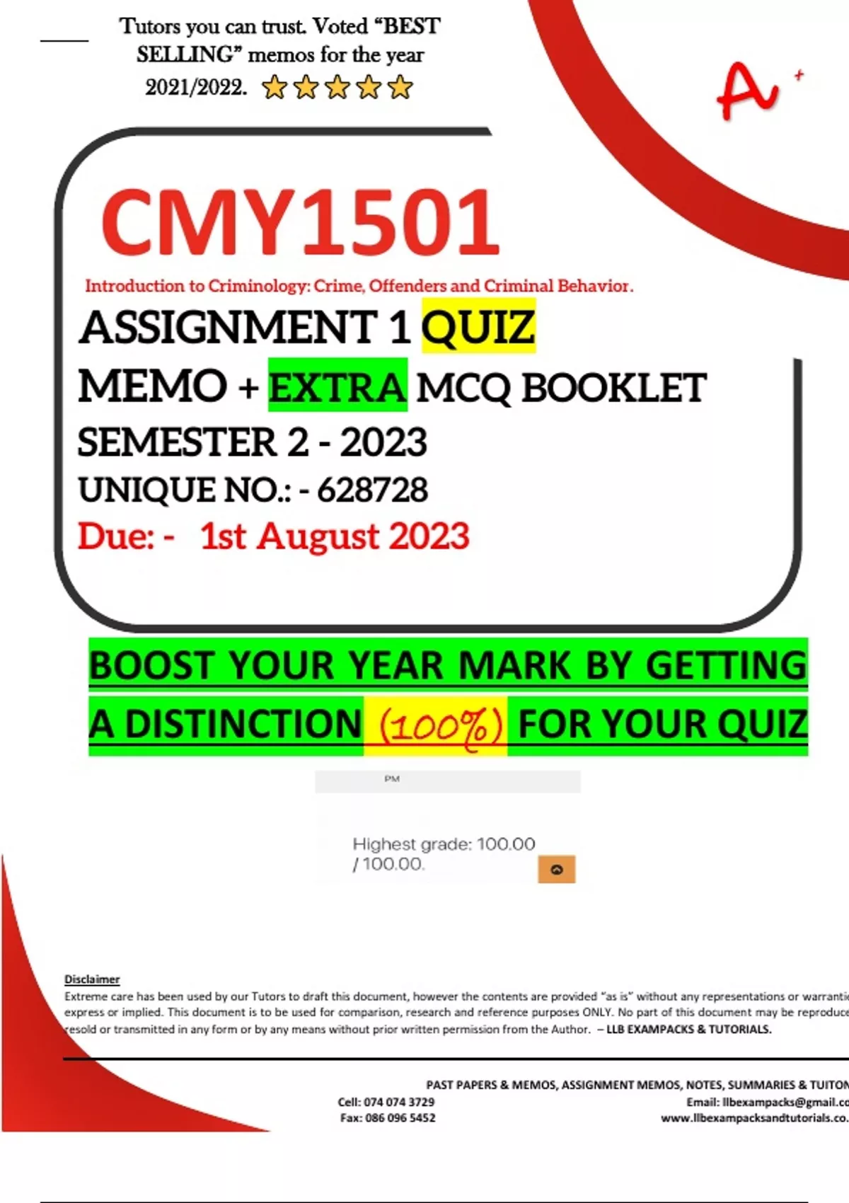 CMY1501 ASSIGNMENT 1 QUIZ MEMO - SEMESTER 2 - 2023 - UNISA (UNIQUE NUMBER - )(DISTINCTION GUARANTEED)️️️️️ LLB EXAMPACKS & TUTORIALS HAS GOT YOUR BACK! We provide you with professional University Homework Help, which are always custom Assignment/Portfolio Guidelines for University Students like you. Our Degree-holding Law Tutors are dedicated to your privacy, your success & your deadlines for Assignments/Portfolios. Our private tutors are available online 24/7! 100% pass rate! We provide assistance with all LLB modules as well as other Degrees. We provide all the resources you need. Affordable rates. We have well experienced professional tutors with more than 10 years of experience. Request a FREE* word document format for any Assignment at Contact us today for more information and bookings for this Semester! :- E-mail :