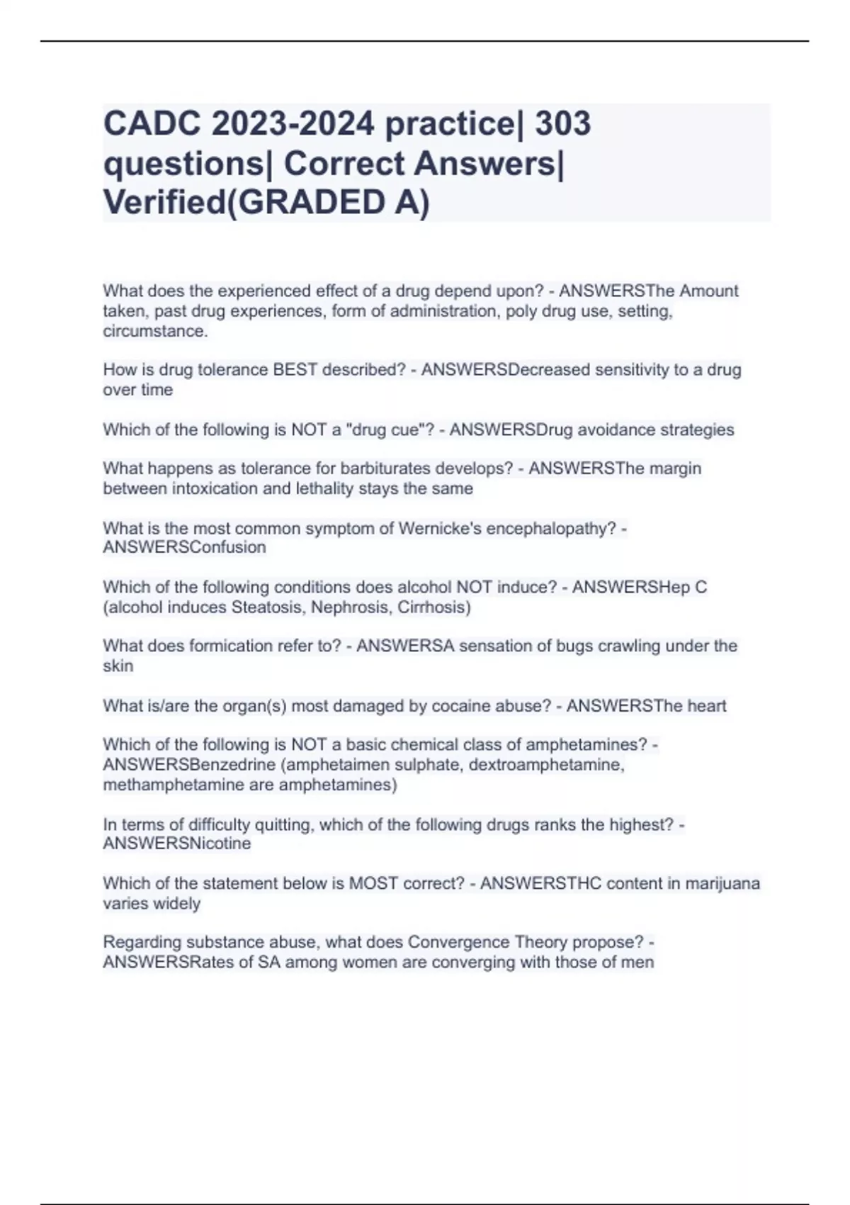 CADC practice| 303 questions| Correct Answers| Verified(GRADED A)CADC practice| 303 questions| Correct Answers| Verified(GRADED A)CADC practice| 303 questions| Correct Answers| Verified(GRADED A)CADC practice| 303 questions| Correct Answers| Verified(GRADED A)What does the experienced effect of a drug depend upon? - ANSWERSThe Amount taken, past drug experiences, form of administration, poly drug use, setting, circumstance. How is drug tolerance BEST described? - ANSWERSDecreased sensitivity to a drug over time Which of the following is NOT a "drug cue"? - ANSWERSDrug avoidance strategies What happens as tolerance for barbiturates develops? - ANSWERSThe margin between intoxication and lethality stays the same What is the most common symptom of Wernicke's encephalopathy? - ANSWERSConfusion Which of the following conditions does alcohol NOT induce? - ANSWERSHep C (alcohol induces Steatosis, Nephrosis, Cirrhosis) What does formicat