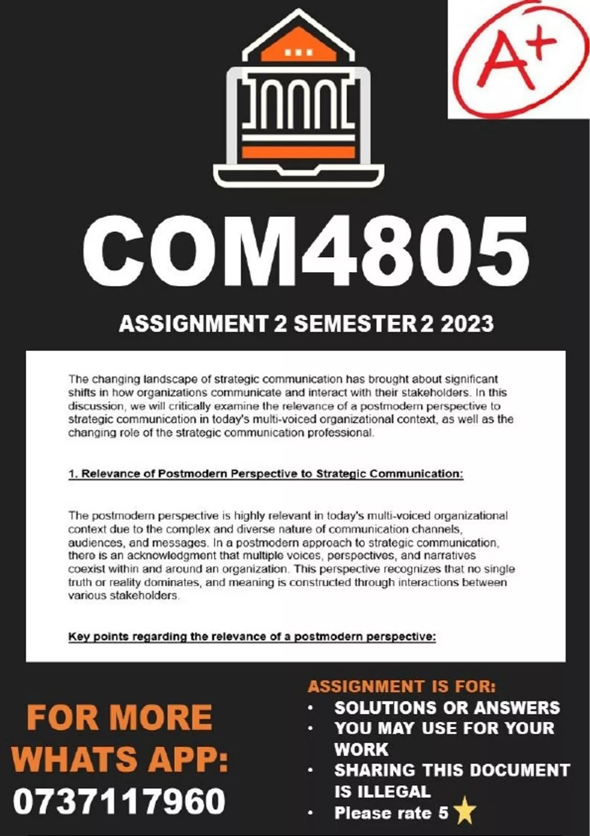 COM4805 Assignment 2 Semester 2 2023 (ANSWERS) The topic of this assignment is the strategic role of communication in the organisation. The assignment question is: Strategic communication, which originated from programmes used in the governmental and military domain (Farwell 2012:2), is essentially applied to emphasise objective-driven communication in various areas such as public relations, health communication, marketing, and financial communication (Holtzhausen & Zerfass 2015:3). This modernistic definition of strategic communication as a communication process that sprouts from an organisation’s strategic plan and is focused on enabling the organisation’s strategic objectives, served as a platform for two-way communication models, such as Shannon and Weaver’s (1949) transmission model, which eventually evolved in discussions of two-way symmetrical and two-way a-symmetrical communication in public relations literature (Holtzhausen & Zerfass 2015:4). The field of communication currently “faces a challenge in coordinating and integrating the communication activities of organisations and in creating a multidisciplinary but unified body of knowledge that better serves communication entities in a society consisting of fragmented audiences and message delivery platforms” (Tindall & Holtzhausen 2011:75). Such changes stimulated a shift towards postmodern thought in strategic communication. This implies a proposed call for a broader acceptance of strategic communication as “the practice of deliberate and purposive communication that a communication agent enacts in the public sphere on behalf of a communicative entity to reach set goals” (Holtzhausen & Zerfass 2013:74). This changing landscape of strategic communication caused the communication professional to step down as the only organisational spokesperson. The communication professional should fulfil a coaching and advisory role to other organisational members to enable and empower them with skills to engage organisational stakeholders. Various elements such as interactive communication technologies and globalisation have led to the replacement of the functional understanding of strategic communication as “one-to-many” communication with rather “many-to-many” communication (Zerfass & Schneider 2018). This has resulted in a reconfiguration of the strategic communication function (Verwey, Benecke & Muir 2017). Considering the above statements, critically discuss the changing landscape of strategic communication in the following terms: The relevance of a postmodern perspective to strategic communication in the current multi-voiced organisational context. The changing role of the strategic communication professional, with specific reference to the shift from roles as technician and manger to coach, advisor and manager of social capital. Content: 90 Technical presentation: 10 TOTAL: 100