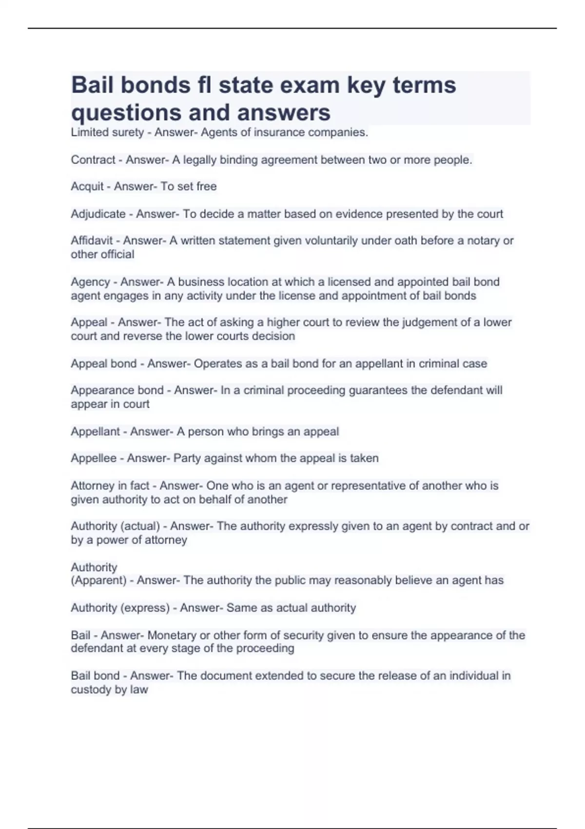 Bail bonds fl state exam key terms questions and answers