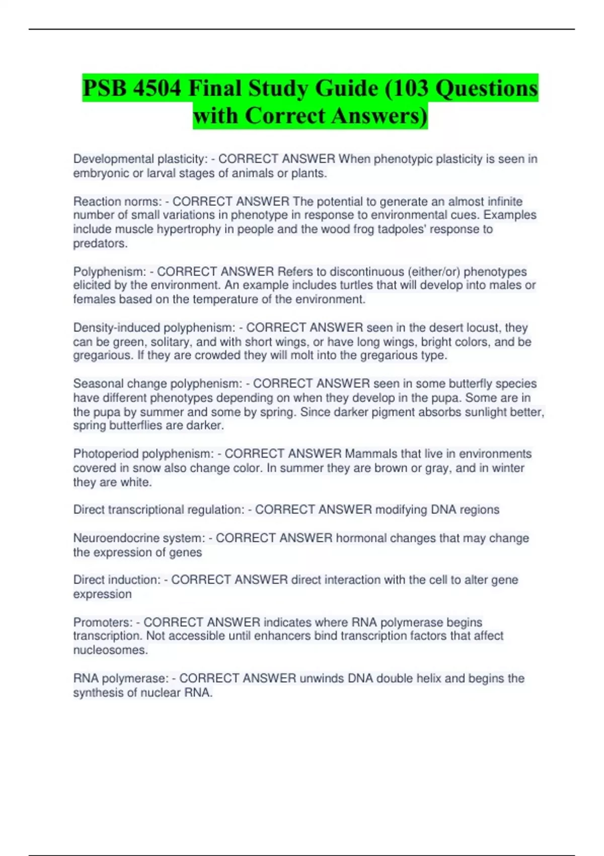PSB 4504 Final Study Guide (103 Questions with Correct Answers) Developmental plasticity: - CORRECT ANSWER When phenotypic plasticity is seen in embryonic or larval stages of animals or plants. Reaction norms: - CORRECT ANSWER The potential to generate an almost infinite number of small variations in phenotype in response to environmental cues. Examples include muscle hypertrophy in people and the wood frog tadpoles' response to predators. Polyphenism: - CORRECT ANSWER Refers to discontinuous (either/or) phenotypes elicited by the environment. An example includes turtles that will develop into males or females based on the temperature of the environment. Density-induced polyphenism: - CORRECT ANSWER seen in the desert locust, they can be green, solitary, and with short wings, or have long wings, bright colors, and be gregarious. If they are crowded they will molt into the gregarious type. Seasonal change polyphenism: - CORRECT ANSWER seen in some butterfly species have different phenotypes depending on when they develop in the pupa. Some are in the pupa by summer and some by spring. Since darker pigment absorbs sunlight better, spring butterflies are darker. Photoperiod polyphenism: - CORRECT ANSWER Mammals that live in environments covered in snow also change color. In summer they are brown or gray, and in winter they are white. Direct transcriptional regulation: - CORRECT ANSWER modifying DNA regions Neuroendocrine system: - CORRECT ANSWER hormonal changes that may change the expression of genes Direct induction: - CORRECT ANSWER direct interaction with the cell to alter gene expression Promoters: - CORRECT ANSWER indicates where RNA polymerase begins transcription. Not accessible until enhancers bind transcription factors that affect nucleosomes. RNA polymerase: - CORRECT ANSWER unwinds DNA double helix and begins the synthesis of nuclear RNA