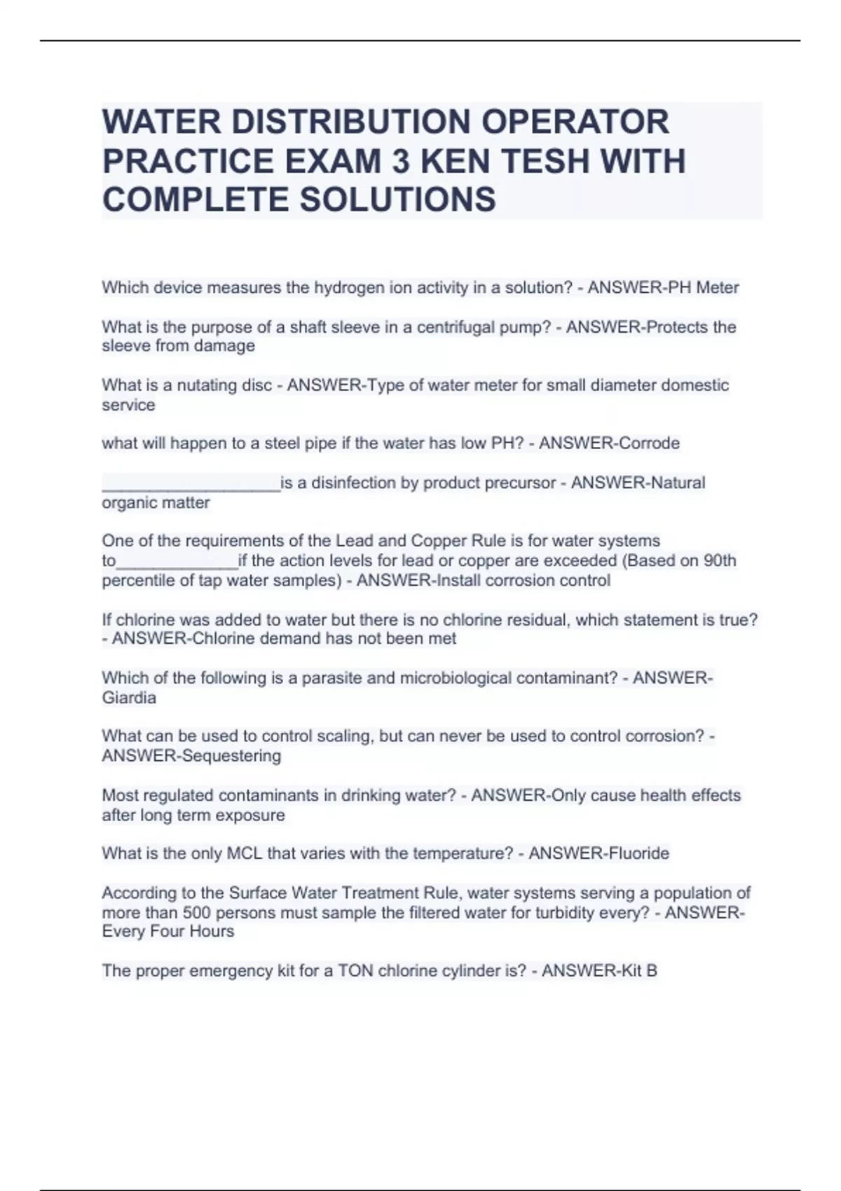 WATER DISTRIBUTION OPERATOR PRACTICE EXAM 3 KEN TESH WITH COMPLETE SOLUTIONSWATER DISTRIBUTION OPERATOR PRACTICE EXAM 3 KEN TESH WITH COMPLETE SOLUTIONSWATER DISTRIBUTION OPERATOR PRACTICE EXAM 3 KEN TESH WITH COMPLETE SOLUTIONSWATER DISTRIBUTION OPERATOR PRACTICE EXAM 3 KEN TESH WITH COMPLETE SOLUTIONS Which device measures the hydrogen ion activity in a solution? - ANSWER-PH Meter What is the purpose of a shaft sleeve in a centrifugal pump? - ANSWER-Protects the sleeve from damage What is a nutating disc - ANSWER-Type of water meter for small diameter domestic service what will happen to a steel pipe if the water has low PH? - ANSWER-Corrode ___________________is a disinfection by product precursor - ANSWER-Natural organic matter One of the requirements of the Lead and Copper Rule is for water systems to_____________if the action levels for lead or copper are exceeded (Based on 90th