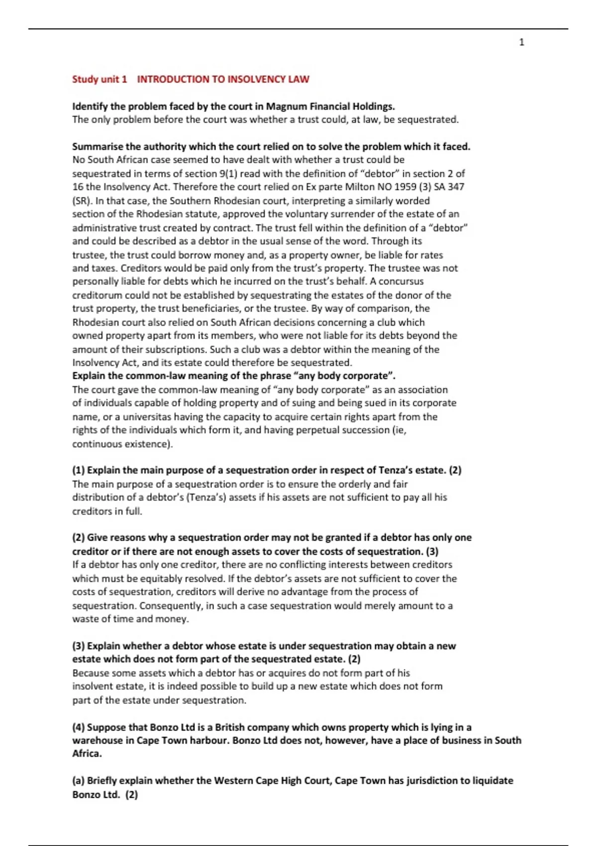(c) Will the Cape Town Magistrate’s Court have jurisdiction to sequestrate Bonzo Ltd’s estate? (1)