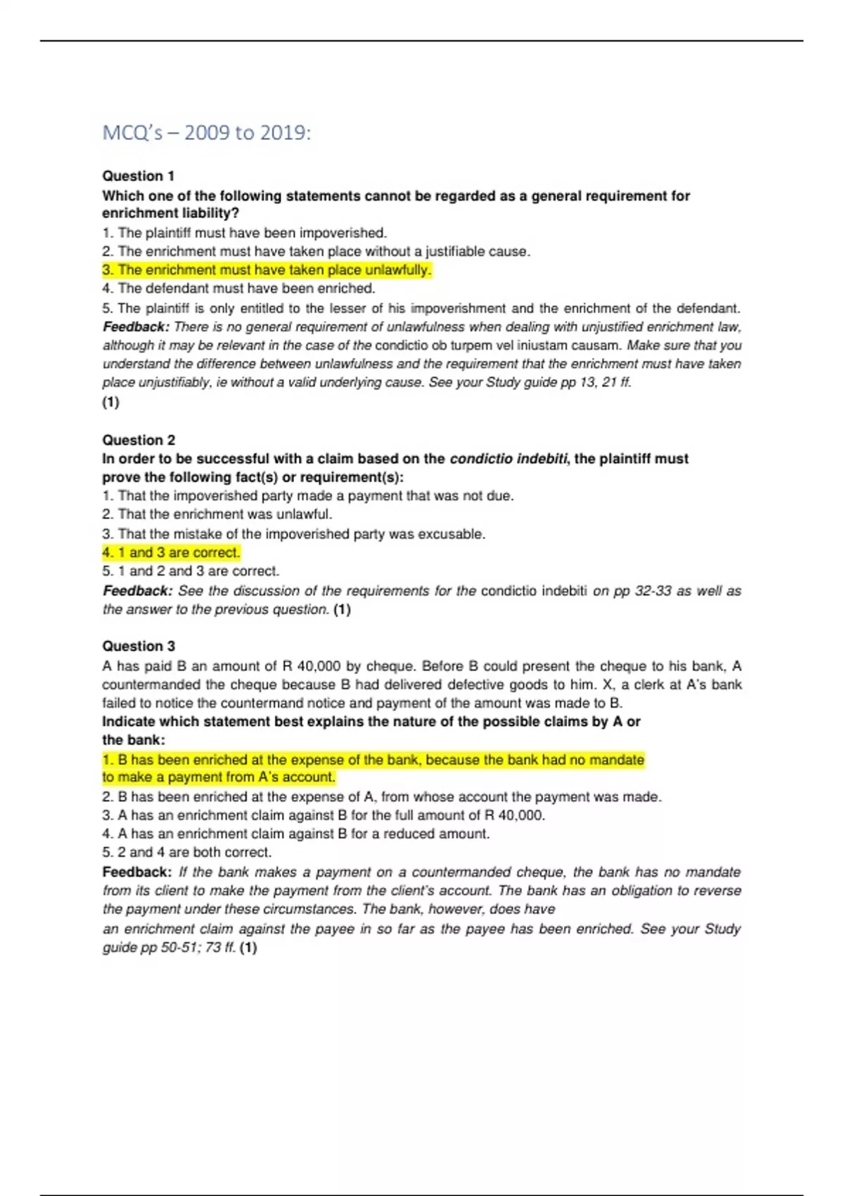 Answer 3 deals with the condictio causa data causa non secuta; Answer 4 deals with the condictio ob