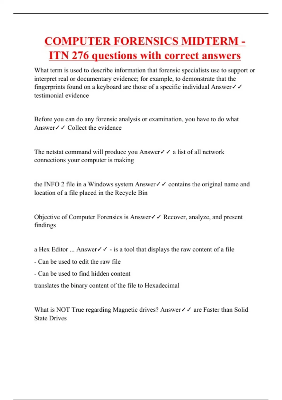 What term is used to describe information that forensic specialists use to support or interpret real or documentary evidence; for example, to demonstrate that the fingerprints found on a keyboard are those of a specific individual Answer testimonial evidence Before you can do any forensic analysis or examination, you have to do what Answer Collect the evidence The netstat command will produce you Answer a list of all network connections your computer is making the INFO 2 file in a Windows system Answer contains the original name and location of a file placed in the Recycle Bin Objective of Computer Forensics is Answer Recover, analyze, and present findings a Hex Editor ... Answer - is a tool that displays the raw content of a file - Can be used to edit the raw file - Can be used to find hidden content translates the binary content of the file to Hexadecimal What is NOT True regarding Magnetic drives? Answer are Faster than Solid State Drives The command :