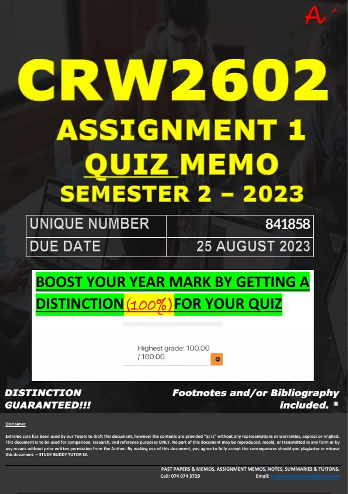 CRW2602 ASSIGNMENT 1 QUIZ MEMO - SEMESTER 2 - 2023 - UNISA - DUE DATE: - 25 AUGUST 2023 (100% PASS - GUARANTEED) BOOST YOUR YEAR MARK BY GETTING 100% FOR YOUR QUIZ!!!!!! CONTACT STUDY BUDDY TUTORS TODAY! We provide you with professional University Homework Help, which are always custom Assignment/Portfolio Guidelines for University Students like you. Our Degree-holding Tutors are dedicated to your privacy, your success & your deadlines for Assignments/Portfolios. Our private tutors are available online 24/7! 100% pass rate! We provide assistance with all modules as well as all Degrees. We provide all the resources you need. Affordable rates. We have well experienced professional tutors with more than 10 years of experience. Request a FREE* word document format for any Assignment at Contact us today for more information and bookings for this Semester! :- E-mail :