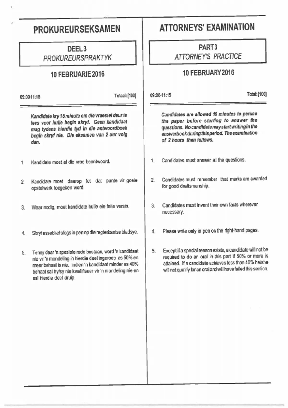 Candidate Attorney Board Exams for Paper 2 - Attorneys Practice (Ethics) 2016 (Feb & Aug) - Question Papers and Memos