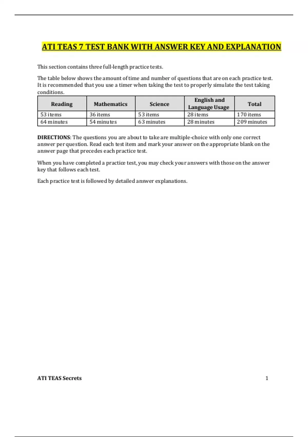 ATI TEAS 7 TEST BANK WITH ANSWER KEY AND EXPLANATION. CONTAINS ALL THE FOUR PARTS, READING COMPREHENSIVE, MATHEMATICS, SCIENCE AND ENGLISH AND LANGUAGE USAGE WITH ANSWER KEY.
