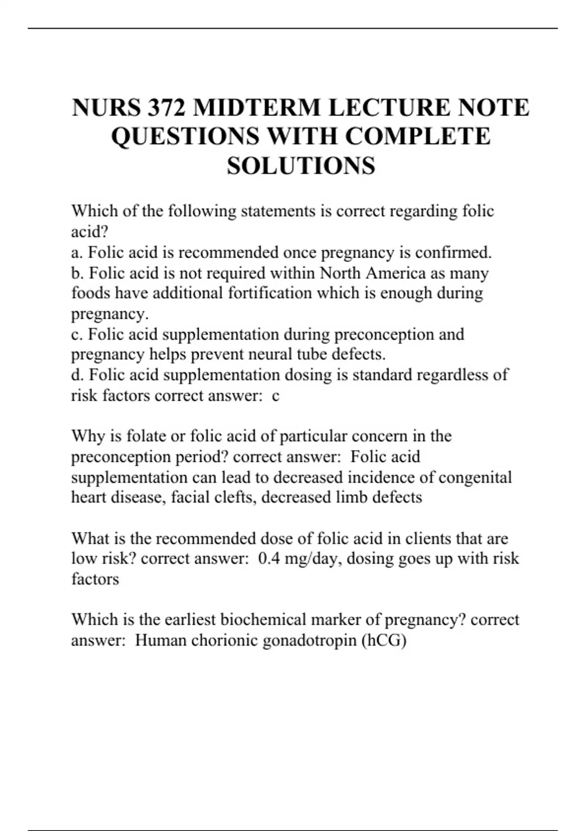 Which of the following statements is correct regarding folic acid? a. Folic acid is recommended once pregnancy is confirmed. b. Folic acid is not required within North America as many foods have additional fortification which is enough during pregnancy. c. Folic acid supplementation during preconception and pregnancy helps prevent neural tube defects. d. Folic acid supplementation dosing is standard regardless of risk factors correct answer: c Why is folate or folic acid of particular concern in the preconception period? correct answer: Folic acid supplementation can lead to decreased incidence of congenital heart disease, facial clefts, decreased limb defects What is the recommended dose of folic acid in clients that are low risk? correct answer: 0.4 mg/day, dosing goes up with risk factors Which is the earliest biochemical marker of pregnancy? correct answer: Human chorionic gonadotropin (hCG) How reliable are over the counter pregnancy tests? correct answer: 90% What are some factors that can influence the accuracy of the results? correct answer: morning (more reliable), gestational age, medications, early symptoms Most clients give birth within how many days of their estimated due date? a. 3 days before 3 days after b. 7 days before to 7 days after c. 14 days before to 14 days after d. 21 days before to 21 days after correct answer: b Why is it important to make an accurate assessment of the estimated due date? correct answer: So you are aware where fetal development is → if growth is on target From a social standpoint: so you can prepare for the arrival, think about work, lifestyle, etc., Mental and physical process of preparing for arrival of fetus Important for genetic testing and screening Care is dependent on how far along client is in their pregnancy