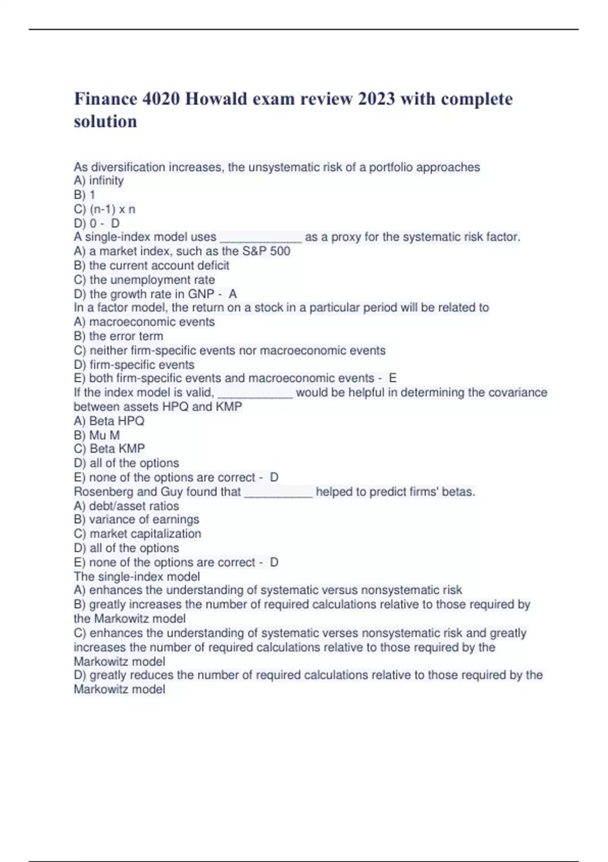 Finance 4020 Howald exam review 2023 with complete solution As diversification increases, the unsystematic risk of a portfolio approaches A) infinity B) 1 C) (n-1) x n D) 0 - D A single-index model uses ____________ as a proxy for the systematic risk factor. A) a market index, such as the S&P 500 B) the current account deficit C) the unemployment rate D) the growth rate in GNP - A In a factor model, the return on a stock in a particular period will be related to A) macroeconomic events B) the error term C) neither firm-specific events nor macroeconomic events D) firm-specific events E) both firm-specific events and macroeconomic events - E If the index model is valid, ___________ would be helpful in determining the covariance between assets HPQ and KMP A) Beta HPQ B) Mu M C) Beta KMP D) all of the options E) none of the options are correct - D Rosenberg and Guy found that __________ helped to predict firms' betas. A) debt/asset ratios B) variance of earnings C) market capitalization D) all of the options E) none of the options are correct - D The single-index model A) enhances the understanding of systematic versus nonsystematic risk B) greatly increases the number of required calculations relative to those required by the Markowitz model C) enhances the understanding of systematic verses nonsystematic risk and greatly increases the number of required calculations relative to those required by the Markowitz model D) greatly reduces the number of required calculations relative to those required by the Markowitz model E) greatly reduces the number of required calculations relative to those required by the Markowitz model and enhances the understanding of systematic verses nonsystematic risk - E Covariances between security returns tend to be A) positive because of economic forces that affect many firms B) positive because of Exchange regulations C) negative because of economic forces that affect many firms D) positive because of SEC regulations E) negative because of SEC regulations - A One "cost" of the single-index model is that it A) prohibits specialization of efforts within the security analysis industry B) is virtually impossible to apply C) is legally prohibited by the SEC D) allows for only two kinds of risk - macro risk and micro risk E) requires forecasts of the money supply - D The security characteristic line (SCL) associated with the single-index model is a plot of A) the security's returns on the vertical axis and Beta on the horizontal axis B) the security's returns on the vertical axis and the market index's returns on the horizontal axis C) the market index's excess returns on the vertical axis and the security's excess returns on the horizontal axis D) the market index's returns on the vertical axis and the security's returns on the horizontal axis E) the security's excess returns on the vertical axis and the market index's excess returns on the horizontal axis - E Assume that stock market returns do not resemble a single-index structure. An investment fund analyzes 40 stocks in order to construct a mean-variance efficient portfolio constrained by 40 investments. They will need to calculate ________ expected returns and ___________ variances of returns. A) 40; 40 B) 100; 100 C) 4950; 4950 D) 4950; 100 E) None of the options are correct - A Assume that stock market returns do follow a single-index structure. An investment fund analyzes 60 stocks in order to construct a mean-variance efficient portfolio constrained by 60 investments. They will need to calculate ___________ estimate of expected returns and ___________ estimate of sensitivity coefficients to the macroeconomic factor. A) 200; 19,900 B) 19,900; 19,900 C) 60; 60 D) 200; 200 E) None of the options are correct - C If a firm's beta was calculated as 1.35 in a regression equation, a commonly-used adjustment technique would provide an adjusted beta of A) between 1.0 and 1.35 B) zero or less C) between 0.0 and 1.0 D) equal to 1.35 E) greater than 1.35 - A In the context of the Capital Asset Pricing Model (CAPM), the relevant measure of risk is A) variance of returns B) beta C) standard deviation of returns D) unique risk - B In the context of the Capital Asset Pricing Model (CAPM), the relevant risk is A) variance of returns B) market risk C) standard deviation of returns D) unique risk - B According the the Capital Asset Pricing Model (CAPM), a well diversified portfolio's rate of return is a function of A) unique risk B) systematic risk C) reinvestment risk D) unsystematic risk - B The market portfolio has a beta of A) 0.5 B) 0 C) -1 D) 1 - D Which statement is not true regarding the market portfolio? A) it includes all publicly-traded financial assets B) it lies on the efficient frontier C) it is the tangency point between the capital market line and the indifference curve D) all securities in the market portfolio are held in proportion to their market values E) all of the options are true - C The market risk, beta, of a security is equal to A) the variance of the security's returns divided by the variance of the market's returns B) the covariance between the security and market returns divided by the standard deviation of the market's returns C) the covariance between the security's return and the market return divided by the variance of the market's returns D) the variance of the security's returns divided by the covariance between the security and market returns - C According to the Capital Asset Pricing Model (CAPM), a security with a A) zero alpha is considered to be a good buy B) positive alpha is considered to be underpriced C) positive alpha is considered overpriced D) negative alpha is considered to be a good buy - B What is the expected return of a zero-beta security? A) the risk-free rate B) zero rate of return C) a negative rate of return D) the market rate of return - A Studies of liquidity spreads in security markets have shown that A) illiquid stocks are good investments for frequent, short-term trad