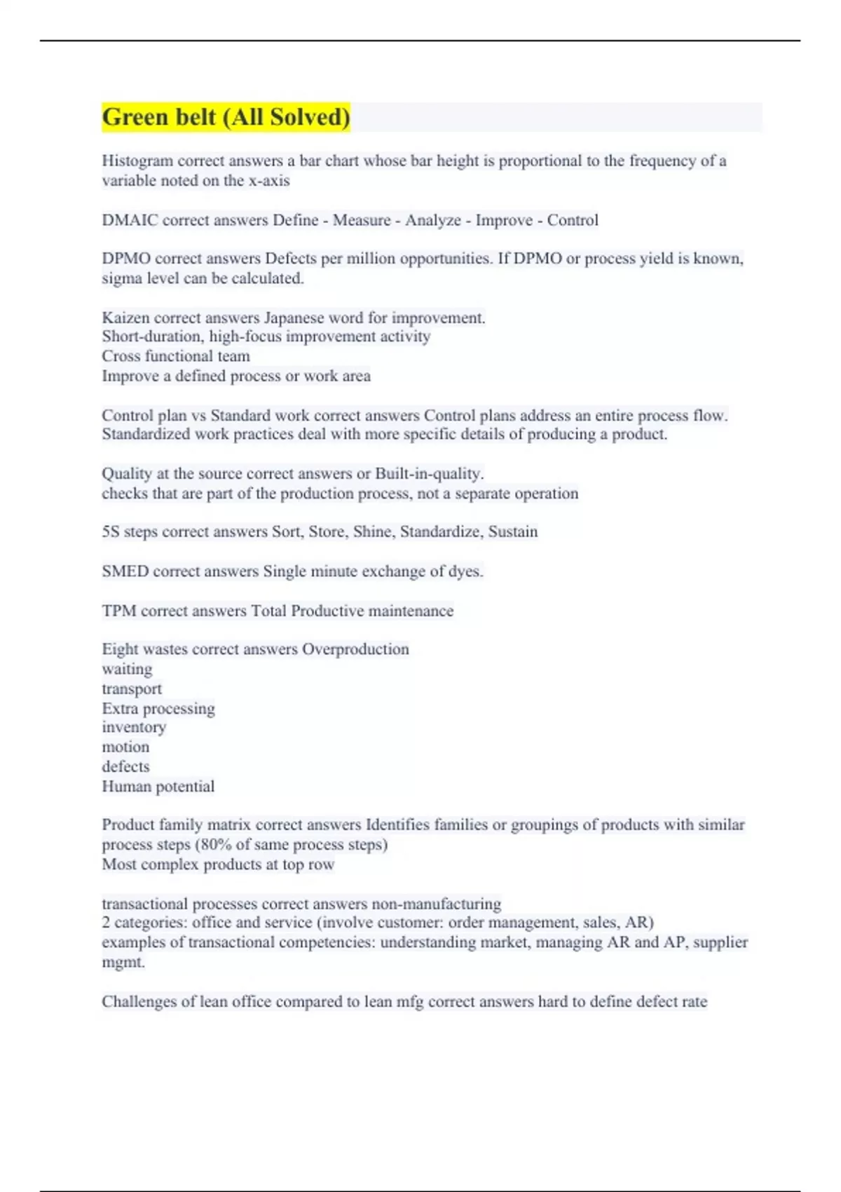Histogram correct answers a bar chart whose bar height is proportional to the frequency of a variable noted on the x-axis DMAIC correct answers Define - Measure - Analyze - Improve - Control DPMO correct answers Defects per million opportunities. If DPMO or process yield is known, sigma level can be calculated. Kaizen correct answers Japanese word for improvement. Short-duration, high-focus improvement activity Cross functional team Improve a defined process or work area Control plan vs Standard work correct answers Control plans address an entire process flow. Standardized work practices deal with more specific details of producing a product. Quality at the source correct answers or Built-in-quality. checks that are part of the production process, not a separate operation 5S steps correct answers Sort, Store, Shine, Standardize, Sustain SMED correct answers Single minute exchange of dyes. TPM correct answers Total Productive maintenance Eight wastes correct answers Overproduction waiting transport Extra processing inventory motion defects Human potential Product family matrix correct answers Identifies families or groupings of products with similar process steps (80% of same process steps) Most complex products at top row transactional processes correct answers non-manufacturing 2 categories: office and service (involve customer: order management, sales, AR) examples of transactional competencies: understanding market, managing AR and AP, supplier mgmt. Challenges of lean office compared to lean mfg correct answers hard to define defect rate