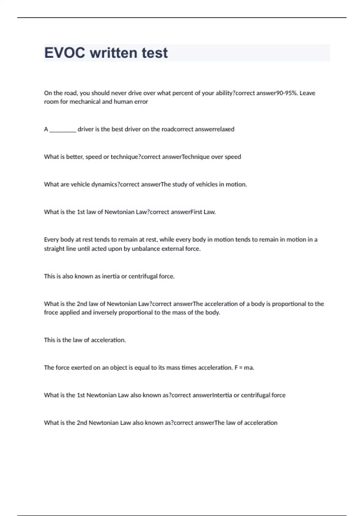On the road, you should never drive over what percent of your ability? 90-95%. Leave room for mechanical and human error A ________ driver is the best driver on the road relaxed What is better, speed or technique? Technique over speed What are vehicle dynamics? The study of vehicles in motion. What is the 1st law of Newtonian Law? First Law. Every body at rest tends to remain at rest, while every body in motion tends to remain in motion in a straight line until acted upon by unbalance external force. This is also known as inertia or centrifugal force. What is the 2nd law of Newtonian Law? The acceleration of a body is proportional to the froce applied and inversely proportional to the mass of the body. This is the law of acceleration. The force exerted on an object is equal to its mass times acceleration. F = ma. What is the 1st Newtonian Law also known as? Intertia or centrifugal force What is the 2nd Newtonian Law also known as? The law of acceleration What is the 3rd Newtonian Law? For every action force there is an equal and opposite reaction force. This is the law of the conservation of energy: Momentum. What is the 3rd Newtonian law also known as? Momentum What word is used in each of Newton's Laws of Motion? Force What is force? Energy that causes or alters motion What are the types of force? Centrifugal force, centripetal force, inertia, momentum, velocity, gravity, friction. What is centrifugal force? (first newtonian law) As a vehicle travels around a corner, there is an increase in centrifugal force which IMPELS AN OBJECT OUTWARD FROM THE CENTER OF ROTATION. What is centripetal force? The OPPOSITE of centrifugal force, pushing the object toward the center. Characterized by the vehicle's ability to maintain its intended path while cornering. What is intertia? (First newtonian law) RESISTANCE to motion, action, or change. What is momentum? (Third newtonian law) The greater the speed or mass, the more time and distance needed to effect a stop. What is velocity? The rate of change of position relative to time. Speed of motion in a particular direction. Velocity is a vector quality, having both magnitude and direction. Velocity forumula: V = S x 1.47.