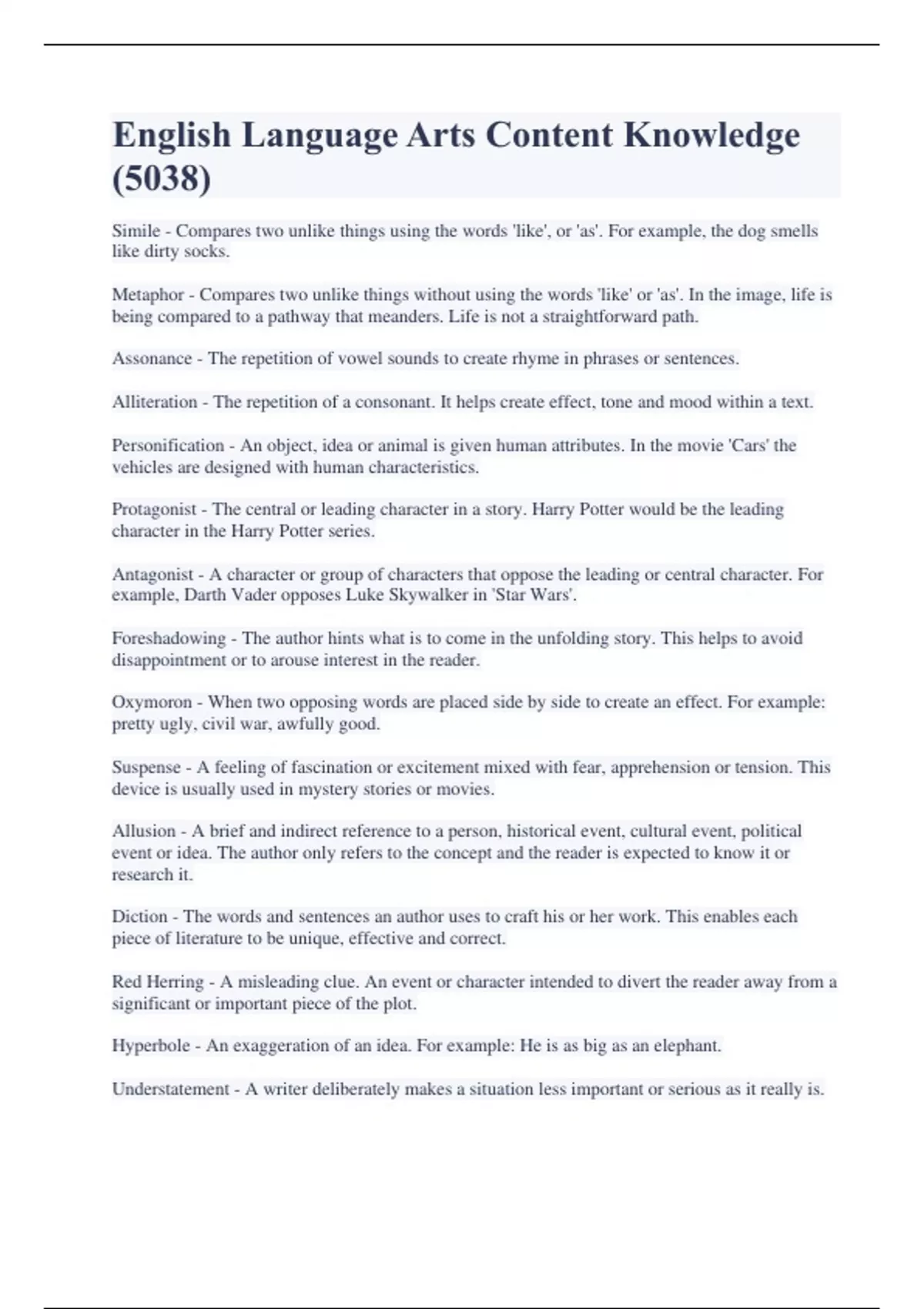 English Language Arts Content Knowledge (5038) Simile - Compares two unlike things using the words 'like', or 'as'. For example, the dog smells like dirty socks. Metaphor - Compares two unlike things without using the words 'like' or 'as'. In the image, life is being compared to a pathway that meanders. Life is not a straightforward path. Assonance - The repetition of vowel sounds to create rhyme in phrases or sentences. Alliteration - The repetition of a consonant. It helps create effect, tone and mood within a text. Personification - An object, idea or animal is given human attributes. In the movie 'Cars' the vehicles are designed with human characteristics. Protagonist - The central or leading character in a story. Harry Potter would be the leading character in the Harry Potter series. Antagonist - A character or group of characters that oppose the leading or central character. For example, Darth Vader opposes Luke Skywalker in 'Star Wars'. Foreshadowing - The author hints what is to come in the unfolding story. This helps to avoid disappointment or to arouse interest in the reader. Oxymoron - When two opposing words are placed side by side to create an effect. For example: pretty ugly, civil war, awfully good. Suspense - A feeling of fascination or excitement mixed with fear, apprehension or tension. This device is usually used in mystery stories or movies. Allusion - A brief and indirect reference to a person, historical event, cultural event, political event or idea. The author only refers to the concept and the reader is expected to know it or research it. Diction - The words and sentences an author uses to craft his or her work. This enables each piece of literature to be unique, effective and correct. Red Herring - A misleading clue. An event or character intended to divert the reader away from a significant or important piece of the plot. Hyperbole - An exaggeration of an idea. For example: He is as big as an elephant. Understatement - A writer deliberately makes a situation less important or serious as it really is. Pun - A humorous play on words that suggest more than one meaning. Exploiting multiple meanings of words. For example: Some aquatic mammals at the zoo escaped. It was otter chaos. Onomatopoeia - A word that resembles or imitates a sound. Point of View - The perspective from which a writer presents or recounts his or her story. First person point of view - The words 'I' or 'we' is used to narrate the story. For example: I walked down the road and saw a rabbit run across the road. Second person point of view - The word 'you' is used. The writer controls all of the information and the reader has little input into the story or information. For example: You open your eyes and the sun is already in the sky. Third person omniscient point of view - The words 'she', and 'he' is used in this narrative form. This point of view tells the reader what two or more characters are talking about. The narrator knows the thoughts and feelings of all of the characters in the story. Third person limited point of view - The narrator only knows the thoughts and feelings of one character in a story. The narrator refers to the characters as 'he', or 'she'. Analogy - Comparing two objects for the purpose of explaining something. For example: a heart and a pump. Imagery - The authors use of vivid words and descriptions to help the reader create an image in his or her mind. Often times all senses are used to create imagery. Symbol - An object that represents or stands for an idea, belief or action. A heart is a sign of love. Theme - The central topic or idea of a text. For example: the central topic of 'Lord of the Flies' is survival. Flat character/static character - A minor character in fiction that does not undergo any changes. They are one dimensional and lack emotional depth. Round character - A character that has complex personality and clear human traits. Dynamic character - A complex character that undergoes a significant change. For example: Ebenezer Scrooge undergoes a change from being very selfish to very giving. Foil - A character who attempts to prevent another character (usually the protagonist) from achieving success. Setting - The location and time frame in which a narrative takes place. Characters are often dependent on the location and time for their development. Irony - Intended words have a different meaning that what is actually being said. Dramatic irony - The audience knows more about the present or future circumstances than the characters themselves. Literal language - The most obvious and straightforward production of a text. There is no hidden or metaphorical meanings in the text. Figurative language - Language that uses several different literary devices such as similes and metaphors. It is open to interpretation and is more poetic in style. James Fenimore Cooper - First novel 1820 - famous series - Leatherstocking Tales (5) incl. The Pioneers (1823), The Last of the Mohicans (1826), The Prairie (1827), The Pathfinder (1840), The Deerslayer (1841). First book was Precaution, which attempted to Satirize Jane Austen's novels. Last of the Mohicans - James Fenimore Cooper - 1826 Main character- Natty Bumppo -nickname: Hawkeye - brave and resourceful woodsman armed with unerringly long rifle. Setting: 1757, Upstate NY, Seven Yrs. War. Romantic Allegory- symbolizes Native American removal from the land. Heightened formal rhetoric Harriet Beecher Stowe - Born in CT 1811- Wrote Uncle Tom's Cabin in outraged response to Fugitive Slave Law of 1850. Uncle Tom's Cabin - Story of a slave sold from Kentucky into a life of danger and uncertainty. Embolden by his abiding faith - allows him to forgive his final slave master's torture. Rescues Eva, white girl, whose father buys him and intends to emancipate him after Eva's death, but is killed before he can. Sold to evil Simon Legree eventually dies a martyrs death. Huckleberry Finn - Mark Twain. 1884. First time American vernacular,