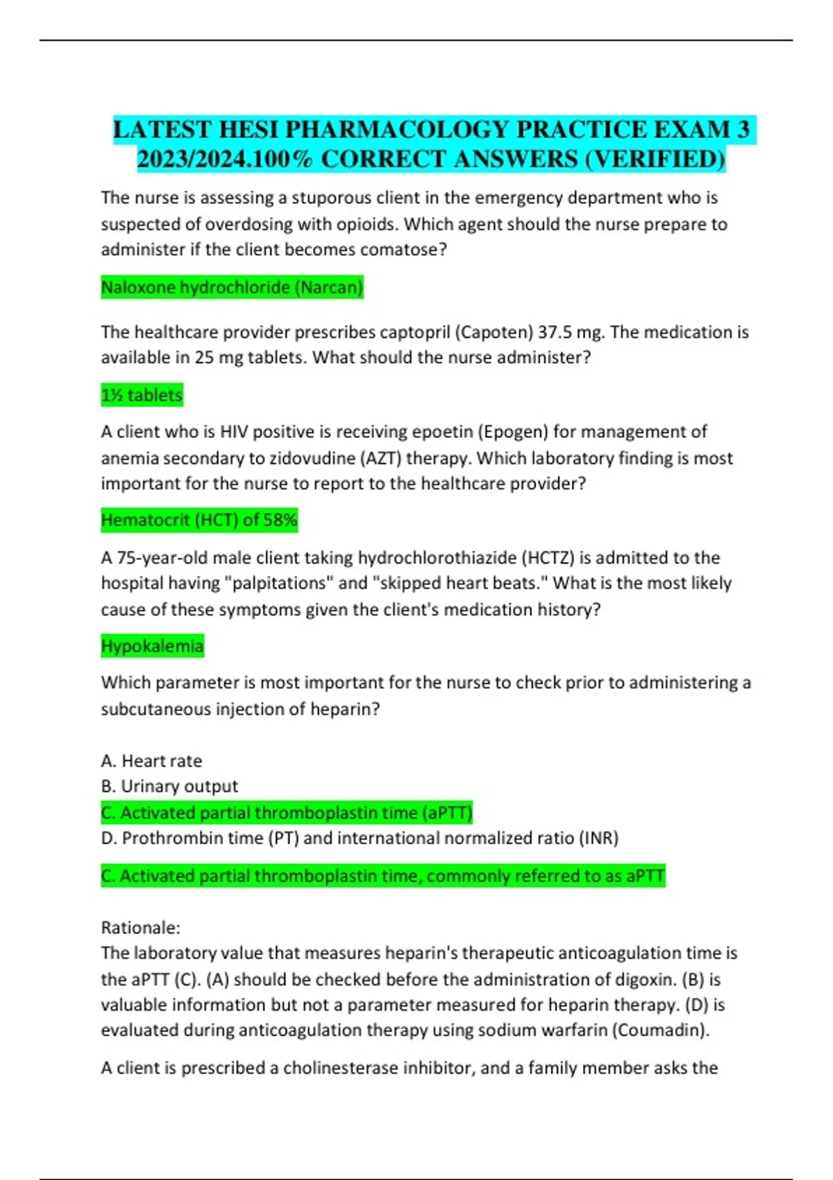 LATEST HESI PHARMACOLOGY PRACTICE EXAM 3 2023/2024.100% CORRECT ANSWERS (VERIFIED) The nurse is assessing a stuporous client in the emergency department who is suspected of overdosing with opioids. Which agent should the nurse prepare to administer if the client becomes comatose? The healthcare provider prescribes captopril (Capoten) 37.5 mg. The medication is available in 25 mg tablets. What should the nurse administer? A client who is HIV positive is receiving epoetin (Epogen) for management of anemia secondary to zidovudine (AZT) therapy. Which laboratory finding is most important for the nurse to report to the healthcare provider? A 75-year-old male client taking hydrochlorothiazide (HCTZ) is admitted to the hospital having "palpitations" and "skipped heart beats." What is the most likely cause of these symptoms given the client's medication history? Which parameter is most important for the nurse to check prior to administering a subcutaneous injection of heparin?