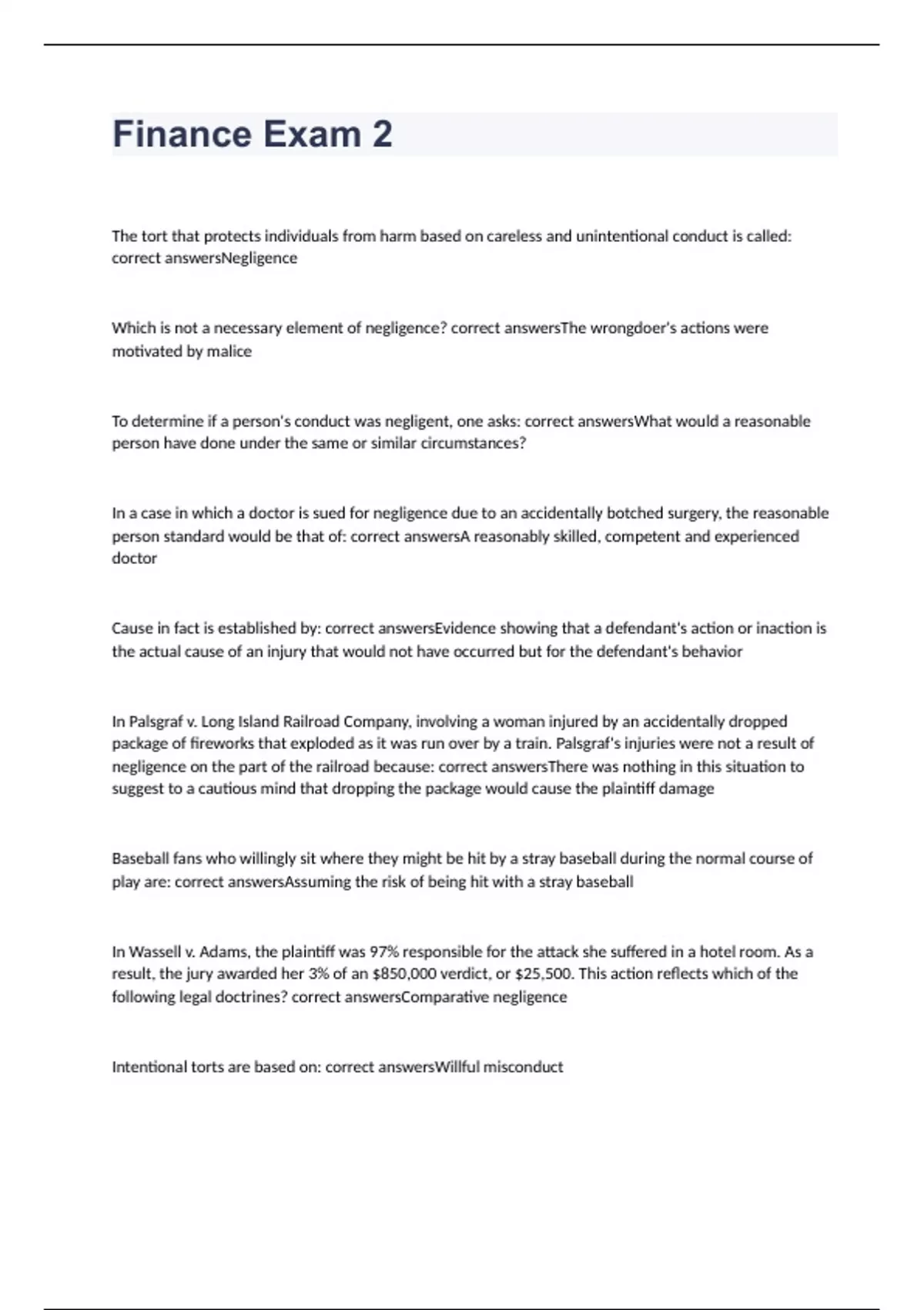 The tort that protects individuals from harm based on careless and unintentional conduct is called: correct answersNegligence Which is not a necessary element of negligence? correct answersThe wrongdoer's actions were motivated by malice To determine if a person's conduct was negligent, one asks: correct answersWhat would a reasonable person have done under the same or similar circumstances? In a case in which a doctor is sued for negligence due to an accidentally botched surgery, the reasonable person standard would be that of: correct answersA reasonably skilled, competent and experienced doctor Cause in fact is established by: correct answersEvidence showing that a defendant's action or inaction is the actual cause of an injury that would not have occurred but for the defendant's behavior In Palsgraf v. Long Island Railroad Company, involving a woman injured by an accidentally dropped package of fireworks that exploded as it was run over by a train. Palsgraf's injuries were not a result of negligence on the part of the railroad because: correct answersThere was nothing in this situation to suggest to a cautious mind that dropping the package would cause the plaintiff damage Baseball fans who willingly sit where they might be hit by a stray baseball during the normal course of play are: correct answersAssuming the risk of being hit with a stray baseball In Wassell v. Adams, the plaintiff was 97% responsible for the attack she suffered in a hotel room. As a result, the jury awarded her 3% of an $850,000 verdict, or $25,500. This action reflects which of the following legal doctrines? correct answersComparative negligence Intentional torts are based on: correct answersWillful misconduct