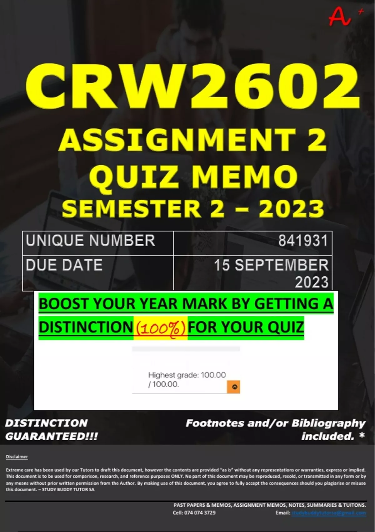 CRW2602 ASSIGNMENT 2 QUIZ MEMO - SEMESTER 2 - 2023 - UNISA - DUE DATE: - 15 SEPTEMBER 2023 (100% PASS - GUARANTEED) BOOST YOUR YEAR MARK BY GETTING 100% FOR YOUR QUIZ!!!!!! CONTACT STUDY BUDDY TUTORS TODAY! We provide you with professional University Homework Help, which are always custom Assignment/Portfolio Guidelines for University Students like you. Our Degree-holding Tutors are dedicated to your privacy, your success & your deadlines for Assignments/Portfolios. Our private tutors are available online 24/7! 100% pass rate! We provide assistance with all modules as well as all Degrees. We provide all the resources you need. Affordable rates. We have well experienced professional tutors with more than 10 years of experience. Request a FREE* word document format for any Assignment at Contact us today for more information and bookings for this Semester! :- E-mail :