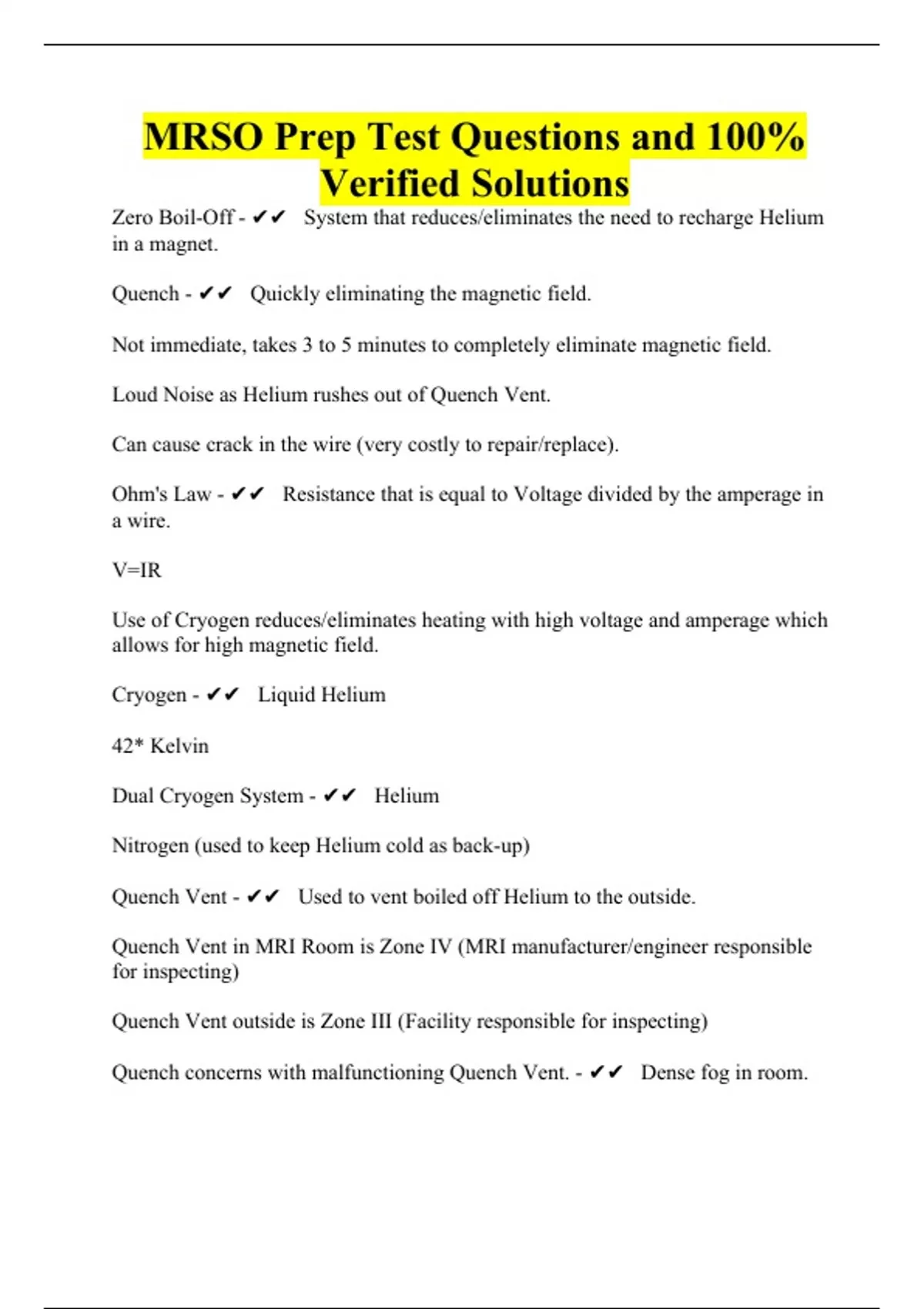 Zero Boil-Off - System that reduces/eliminates the need to recharge Helium in a magnet. Quench - Quickly eliminating the magnetic field. Not immediate, takes 3 to 5 minutes to completely eliminate magnetic field. Loud Noise as Helium rushes out of Quench Vent. Can cause crack in the wire (very costly to repair/replace). Ohm's Law - Resistance that is equal to Voltage divided by the amperage in a wire. V=IR Use of Cryogen reduces/eliminates heating with high voltage and amperage which allows for high magnetic field. Cryogen - Liquid Helium 42* Kelvin Dual Cryogen System - Helium Nitrogen (used to keep Helium cold as back-up) Quench Vent - Used to vent boiled off Helium to the outside. Quench Vent in MRI Room is Zone IV (MRI manufacturer/engineer responsible for inspecting) Quench Vent outside is Zone III (Facility responsible for inspecting) Quench concerns with malfunctioning Quench Vent. - Dense fog in room. Can rain or snow which can contain Oxygen which is a fire risk. Hypothermia/Frostbite due to lowered room temperature. Aphyxiation Ruptured Ear Drums because of increased pressure in room. Difficulty opening door to Zone III due to increased pressure. May have to break window to release pressure. Magnet doesn't immediately lose its magnetic field. Peripheral Nerve stimulation due to change in magnetic field. Static Magnetic Field Concerns - Translation/Rotational Force *No adverse effects to patients or fetus have been noted to individuals exposed to up to 8T. Static Magnetic Field Occupational Exposure Limits - ICNIRP - Head and trunk is limited to a magnetic flux density of 2T - Limits are limited to a magnetic flux density of 8T IEC - Head and trunk is limited to a magnetic flux density of 4T. - Limbs are limited to a magnetic flux density of 4T. Static Magnetic Field General Public Exposure Limits - 400mT FDA Limits for Static Magnetic Field - 1 month old - 4T 1 month old - 8T Exposure to Static Magnetic Field of 4T - Requires approval. Time Varying Gradient Field Concerns - Electrical induction due to principle of Faraday's Law. Cardiac Fibrilation (not reported). Diaphragm Spasm - cause difficulty breathing. Brain Peripheral Nerve Stimulation - limited to the comfort of the patient. Time-Varying Gradient Field Normal Operating Mode Limits - IEC/FDA Normal Operating Mode - 80% of the maximum dB/dt exposure. = +1.0 * rb(1+0.36/teff) Time-Varying Gradient Field First Level Mode Limits - IEC/FDA 100% of the maxiumum dB/dt = 0.8 *rb(1+0.36/teff) Time-Varying Gradient Field Occupational Exposure Limits - ICNRP - restrictions are limited to 100kHz IEC - Limits to peripheral nerve stimulation. Time-Varying RF Field Concerns - The deposit of Heat (measured in SAR). Localized Heating to: Eyes, Fetus, & Testicles. RF Burning. Time-Varying RF Field Temperature Increase Limits - FDA - Whole body Exposure 1* Celsius. Time-Varying RF Field Heating Limits Normal Operating Mode - Increase in core temperature to 0.5* Celsius Increase in whole body SAR to less than 2W/kg Head SAR less than or equal to 3.2 W/kg Time-Varying RF Field Heating Limits First Level Mode - Increase in core temperature to 1* Celsius. Increase in whole body SAR to less than 4W/kg. Head SAR less than or equal to 3.2 W/kg. Time-Varying RF Field Heating Limits Second Level Mode - Increase in core temperature to greater than 1* Celsius. Increase in whole body SAR to greater than 4W/kg. Head SAR less than or equal to greater than 3.2 W/kg. Localized Transmit-Receive Coil Heating Limits for Normal Mode - FDA/IEC SAR equal to or less than 10W/kg in the head or trunk (orbits limited to 1* Celsius). SAR equal to or less than 20W/kg in extremities. Localized Transmit-Receive Coil Heating Limits for First Level Mode - FDA/IEC SAR equal to or less than 20W/kg in the head or trunk (orbits limited to 1* Celsius). SAR equal to or less than 40W/kg in extremities. Localized Transmit-Receive Coil Heating Limits for Second Level Mode - FDA/IEC SAR greater than 20W/kg in the head or trunk (orbits limited to 1* Celsius). SAR greater than 40W/kg in extremities. Time-Varying RF Field Occupational Exposure Limits - IEC - 4W/kg SAR