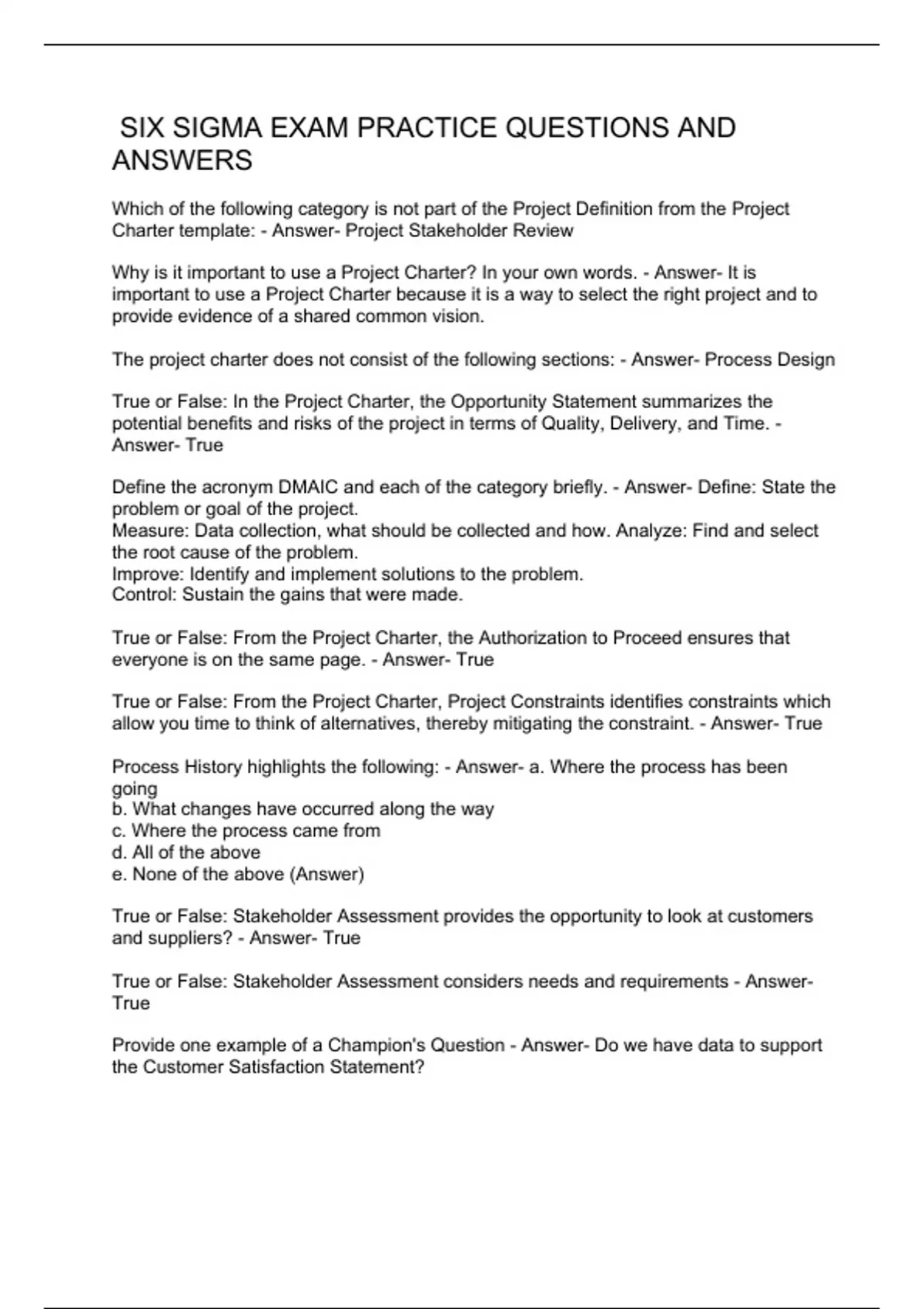Which of the following category is not part of the Project Definition from the Project Charter template: - Answer- Project Stakeholder Review Why is it important to use a Project Charter? In your own words. - Answer- It is important to use a Project Charter because it is a way to select the right project and to provide evidence of a shared common vision. The project charter does not consist of the following sections: - Answer- Process Design True or False: In the Project Charter, the Opportunity Statement summarizes the potential benefits and risks of the project in terms of Quality, Delivery, and Time. - Answer- True Define the acronym DMAIC and each of the category briefly. - Answer- Define: State the problem or goal of the project. Measure: Data collection, what should be collected and how. Analyze: Find and select the root cause of the problem. Improve: Identify and implement solutions to the problem. Control: Sustain the gains that were made. True or False: From the Project Charter, the Authorization to Proceed ensures that everyone is on the same page. - Answer- True True or False: From the Project Charter, Project Constraints identifies constraints which allow you time to think of alternatives, thereby mitigating the constraint. - Answer- True Process History highlights the following: - Answer- a. Where the process has been going b. What changes have occurred along the way c. Where the process came from d. All of the above e. None of the above (Answer) True or False: Stakeholder Assessment provides the opportunity to look at customers and suppliers? - Answer- True True or False: Stakeholder Assessment considers needs and requirements - Answer- True Provide