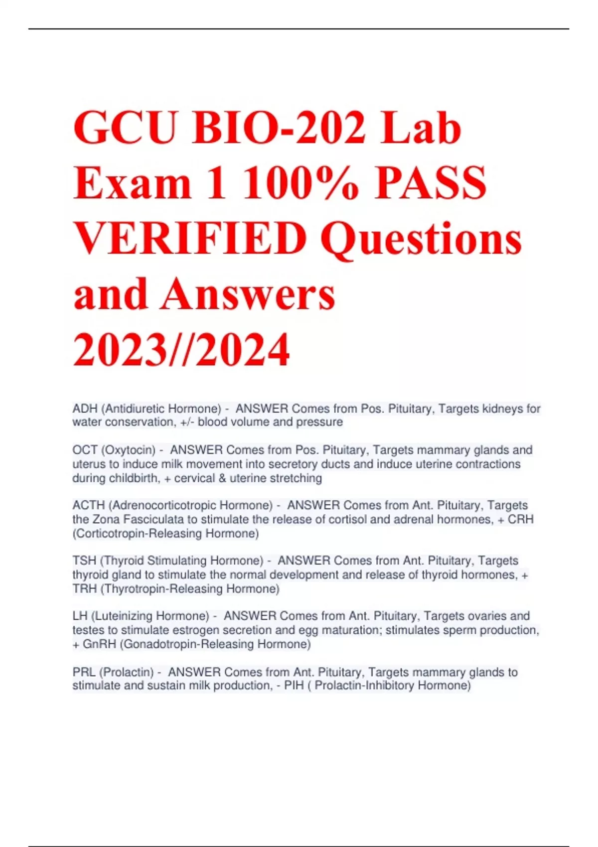 GCU BIO-202 Lab Exam 1 100% PASS VERIFIED Questions and Answers 2023//2024 ADH (Antidiuretic Hormone) - ANSWER Comes from Pos. Pituitary, Targets kidneys for water conservation, +/- blood volume and pressure OCT (Oxytocin) - ANSWER Comes from Pos. Pituitary, Targets mammary glands and uterus to induce milk movement into secretory ducts and induce uterine contractions during childbirth, + cervical & uterine stretching ACTH (Adrenocorticotropic Hormone) - ANSWER Comes from Ant. Pituitary, Targets the Zona Fasciculata to stimulate the release of cortisol and adrenal hormones, + CRH (Corticotropin-Releasing Hormone) TSH (Thyroid Stimulating Hormone) - ANSWER Comes from Ant. Pituitary, Targets thyroid gland to stimulate the normal development and release of thyroid hormones, + TRH (Thyrotropin-Releasing Hormone) LH (Luteinizing Hormone) - ANSWER Comes from Ant. Pituitary, Targets ovaries and testes to stimulate estrogen secretion and egg maturation; stimulates sperm production, + GnRH (Gonadotropin-Releasing Hormone) PRL (Prolactin) - ANSWER Comes from Ant. Pituitary, Targets mammary glands to stimulate and sustain milk production, - PIH ( Prolactin-Inhibitory Hormone) GH (Growth Hormone) - ANSWER Comes from Ant. Pituitary, Targets most cells to promote growth and induce protein synthesis, cell division, and metabolism, (liver, Bone, Muscle), + GHRH/ - GHIH (Growth Hormone Releasing/Inhibiting Hormones) Cortisol - ANSWER Comes from Zona Fasciculata, Targets most cells to promote breakdown of glycogen, fats, and proteins as energy sources; raise blood level of glucose. (Skel mus, Adipose, BVs), + ACTH (Adrenocorticotropic Hormone) Aldosterone - ANSWER Comes from Zona Glomerulosa, Targets the kidney to promote sodium reabsorption and help control the salt-water balance, ^BP, ^water retention, ^regulate electrolytes Epinephrine (Adrenaline) - ANSWER Comes from adrenal medulla, Targets heart, liver, muscle, and adipose tissue to raise blood level of sugar and fatty acids; increases heart rate and force of contraction Norepinephrine - ANSWER Comes from adrenal medulla, Targets smooth muscle of blood vessels to promote constriction or dilation of certain blood vessels, thus helps control the flow of blood volume to different regions of the body T3, T4 (Triiodothyronine, thyroxine) - ANSWER Comes from Thyroid, Target most cells to regulate metabolism, maintain body temp & BP, burn fat, use glucose (except for spleen, testes, uterus), + TSH (Thyroid Stimulating Hormone) Calcitonin - ANSWER Comes from Thyroid, Targets osteoblasts/clasts to lower calcium levels in blood, builds bone PTH (Parathyroid Hormone) - ANSWER Comes from Parathyroid, Targets bones and kidneys to raise calcium level in blood, osteoclasts degrade bone and kidneys absorb Ca2+ Androgens - ANSWER Comes from Zona Reticularis, Required in sperm formation and development of genitals. Maintain sexual traits, growth, and development Insulin - ANSWER Comes from Pancrea, Targets liver, muscle, and adipose tissue to promote cellular uptake of glucose and lowers glucose level in blood Glucagon - ANSWER Comes from Pancreas, Targets liver to promote glycogen breakdown and raise glucose level in bl