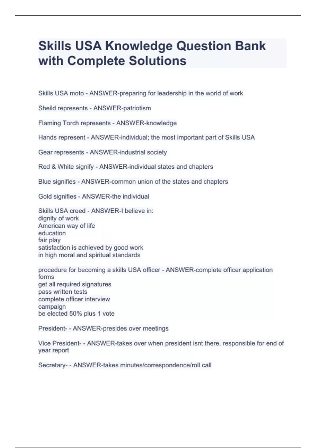 Skills USA Knowledge Question Bank with Complete SolutionsSkills USA Knowledge Question Bank with Complete SolutionsSkills USA Knowledge Question Bank with Complete SolutionsSkills USA Knowledge Question Bank with Complete Solutions Skills USA moto - ANSWER-preparing for leadership in the world of work Sheild represents - ANSWER-patriotism Flaming Torch represents - ANSWER-knowledge Hands represent - ANSWER-individual; the most important part of Skills USA Gear represents - ANSWER-industrial society