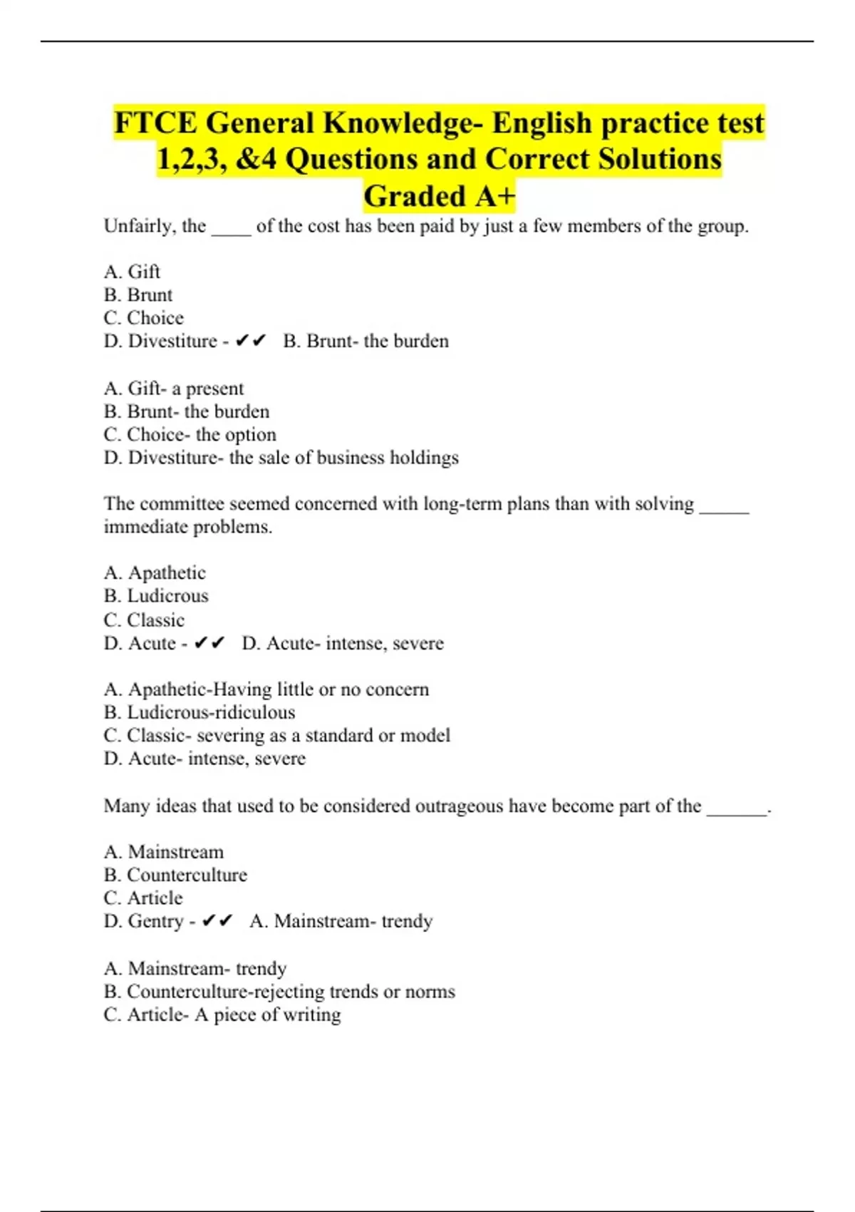 FTCE General Knowledge- English practice test 1,2,3, &4 Questions and Correct Solutions Graded A+