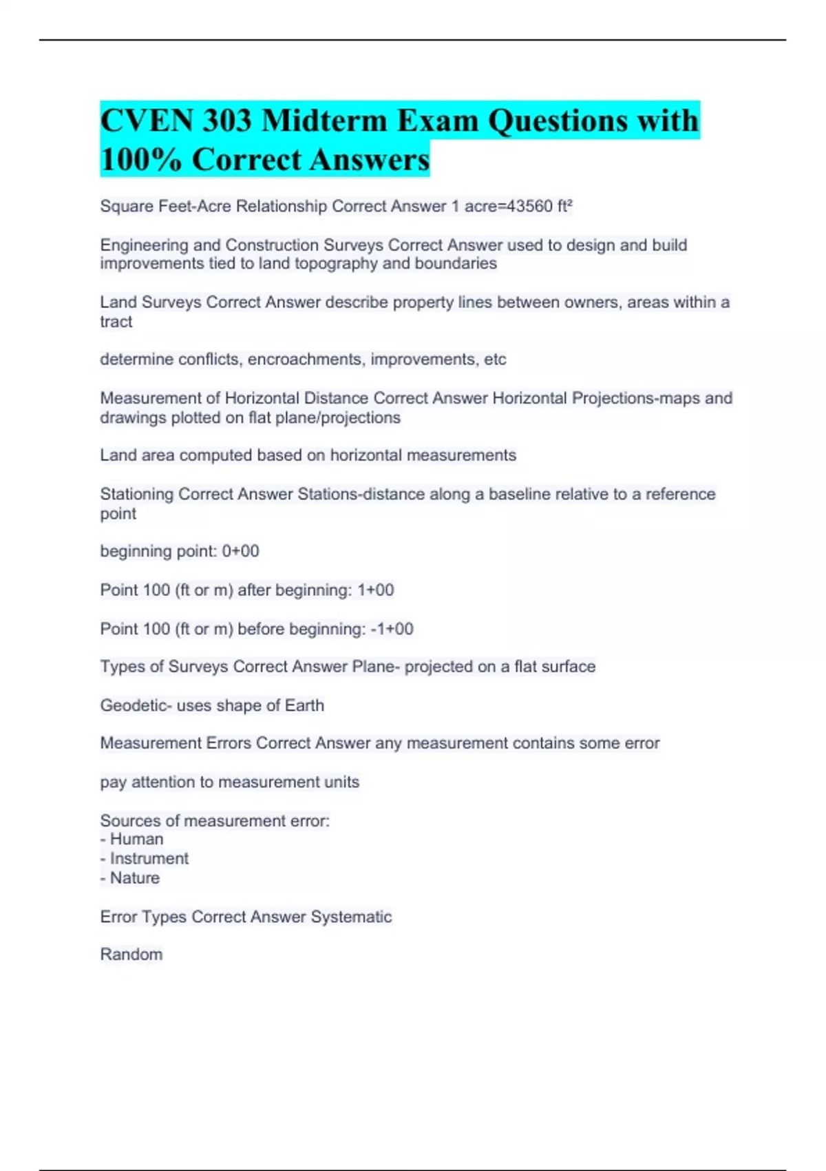 Square Feet-Acre Relationship Correct Answer 1 acre=43560 ft² Engineering and Construction Surveys Correct Answer used to design and build improvements tied to land topography and boundaries Land Surveys Correct Answer describe property lines between owners, areas within a tract determine conflicts, encroachments, improvements, etc Measurement of Horizontal Distance Correct Answer Horizontal Projections-maps and drawings plotted on flat plane/projections Land area computed based on horizontal measurements Stationing Correct Answer Stations-distance along a baseline relative to a reference point beginning point: 0+00 Point 100 (ft or m) after beginning: 1+00 Point 100 (ft or m) before beginning: -1+00 Types of Surveys Correct Answer Plane- projected on a flat surface Geodetic- uses shape of Earth Measurement Errors Correct Answer any measurement contains some error pay attention to measurement units Sources of measurement error: - Human - Instrument - Nature Error Types Correct Answer Systematic Random