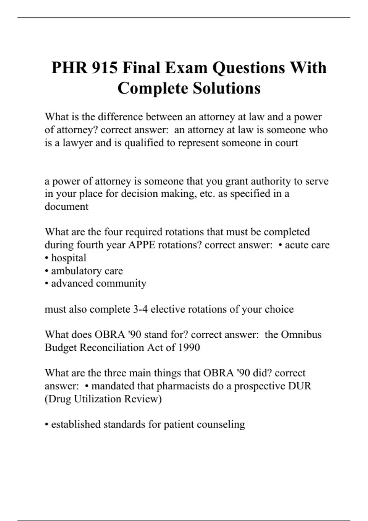 What is the difference between an attorney at law and a power of attorney? correct answer: an attorney at law is someone who is a lawyer and is qualified to represent someone in court a power of attorney is someone that you grant authority to serve in your place for decision making, etc. as specified in a document What are the four required rotations that must be completed during fourth year APPE rotations? correct answer: • acute care • hospital • ambulatory care • advanced community must also complete 3-4 elective rotations of your choice What does OBRA '90 stand for? correct answer: the Omnibus Budget Reconciliation Act of 1990 What are the three main things that OBRA '90 did? correct answer: • mandated that pharmacists do a prospective DUR (Drug Utilization Review) • established standards for patient counseling • established affirmative duty for pharmacists to counsel How did drug utilization reviews change once OBRA '90 was put in place? correct answer: until OBRA '90 drug utilization reviews were done retrospectively and concurrently once OBRA '90 was enacted, pharmacists were required to do prospective DURs (before ever dispensing the med to the patient) OBRA '90 requires that prospective DURs be completed on which type(s) of prescriptions? correct answer: applies to ALL medications - new, original, and refill prescriptions What should be assessed in a prospective DUR? correct answer: • assessment of current therapy and new Rx order - are these okay to take together? • known allergies • rationale for drug therapy - is this necessary? • negative synergies • proper dose and route of administration • interactions - Drug-Drug interactions and Drug-Food interactions • proper utilization of meds - compliance • clinical misuse and abuse The first change to OBRA '90 required that Rx management systems be changed to a _________. correct answer: The first change to OBRA '90 required that Rx management systems be changed to a comprehensive patient record system. What were the requirements for comprehensive patient record systems as outlined in the first change to OBRA '90? correct answer: record system must possess these qualities: • records must be readily retrievable • show previous and current drug therapy • allow determination of impact of new therapy records must include the following patient information: • name • address • telephone # • DOB/age • gender