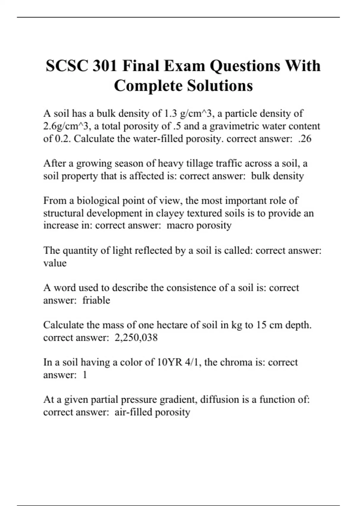 A soil has a bulk density of 1.3 g/cm^3, a particle density of 2.6g/cm^3, a total porosity of .5 and a gravimetric water content of 0.2. Calculate the water-filled porosity. correct answer: .26 After a growing season of heavy tillage traffic across a soil, a soil property that is affected is: correct answer: bulk density From a biological point of view, the most important role of structural development in clayey textured soils is to provide an increase in: correct answer: macro porosity The quantity of light reflected by a soil is called: correct answer: value A word used to describe the consistence of a soil is: correct answer: friable Calculate the mass of one hectare of soil in kg to 15 cm depth. correct answer: 2,250,038 In a soil having a color of 10YR 4/1, the chroma is: correct answer: 1 At a given partial pressure gradient, diffusion is a function of: correct answer: air-filled porosity A principal role of oxygen in soils is: correct answer: oxidation of organic matter Considering a soil as a medium for plant growth in terms of aeration, water supply, and temp, the most desirable structural type is: correct answer: granular Under normal aerated conditions, soil air compared to the atmospheric air is almost always contains the same percentage of: correct answer: N2 The soil components--air, solution, solids--arranged in order of increasing heat capacity (lowest heat capacity first) are: correct answer: air, solids, solution In a clay loam soil horizon having a fine, platy structure, the soil aeration is likely to be: correct answer: poor Daily fluctuations in temp at 15 cm below the soil surface, when compared to daily fluctuations at the soil surface: correct answer: occur later in the day The subsoil in College Station is cooler than either the surface soil or the parent material: correct answer: in early spring Water in soil is: correct answer: a transporting medium The amount of heat stored in the soil in the spring at a given location is primarily a function of soil: correct answer: moisture Water which moves in all directions in a soil consists of water which moves in response to difference in: correct answer: matric potential only Available water in soils is water held between field capacity and: correct answer: wilting coefficient In a soil layer containing large holes or channels closed at the surface, water enters the large holes: correct answer: only after the surrounding soil is saturated Water enters a very sandy subsoil from a clayey surface soil: correct answer: only after the clayey soil is saturated A common primary silicate mineral which weathers to form secondary silicate minerals in soils is: correct answer: feldspars A typical moist surface soil contains approximately 25% by volume ___________. correct answer: water One of the most soluble and therefore, easily weather minerals is: correct answer: sylvite A primary silicate mineral that does not weather to other silicate minerals is: correct answer: quartz The properties of soil are mainly due to the combine effects of __________ acting on parent material over time/ correct answer: climate and biota A property used in distinguishing among minerals in hand-held specimens is: correct answer: luster The soil horizons that the soil solum consist of are: correct answer: O, A, E, B Soils which support aerobic plant growth must contain: correct answer: gaseous oxygen