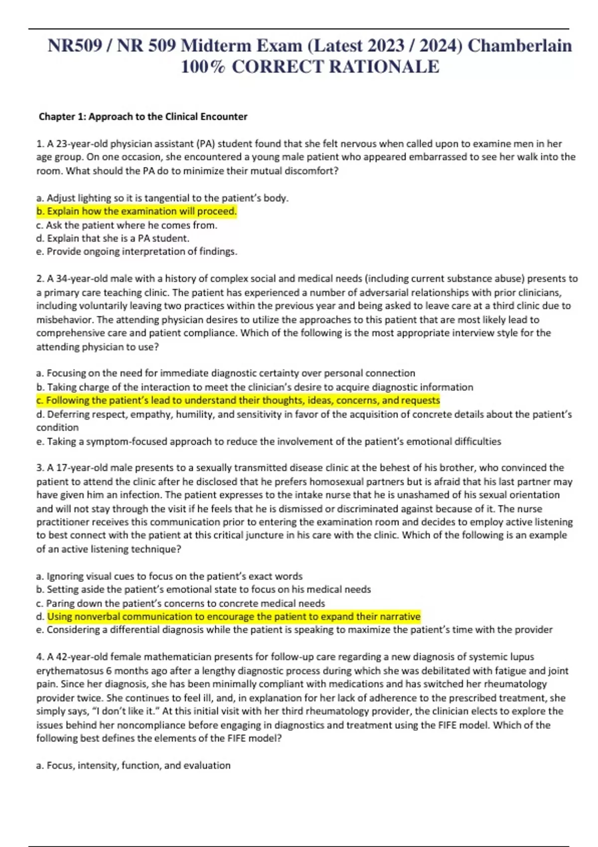 Chapter 1: Approach to the Clinical Encounter 1. A 23-year-old physician assistant (PA) student found that she felt nervous when called upon to examine men in her age group. On one occasion, she encountered a young male patient who appeared embarrassed to see her walk into the room. What should the PA do to minimize their mutual discomfort? a. Adjust lighting so it is tangential to the patient’s body. b. Explain how the examination will proceed. c. Ask the patient where he comes from. d. Explain that she is a PA student. e. Provide ongoing interpretation of findings. 2. A 34-year-old male with a history of complex social and medical needs (including current substance abuse) presents to a primary care teaching clinic. The patient has experienced a number of adversarial relationships with prior clinicians, including voluntarily leaving two practices within the previous year and being asked to leave care at a third clinic due to misbehavior. The attending physician desires to utilize the approaches to this patient that are most likely lead to comprehensive care and patient compliance. Which of the following is the most appropriate interview style for the attending physician to use? a. Focusing on the need for immediate diagnostic certainty over personal connection b. Taking charge of the interaction to meet the clinician’s desire to acquire diagnostic information c. Following the patient’s lead to understand their thoughts, ideas, concerns, and requests d. Deferring respect, empathy, humility, and sensitivity in favor of the acquisition of concrete details about the patient’s condition e. Taking a symptom-focused approach to reduce the involvement of the patient’s emotional difficulties 3. A 17-year-old male presents to a sexually transmitted disease clinic at the behest of his brother, who convinced the patient to attend the clinic after he disclosed that he prefers homosexual partners but is afraid that his last partner may have given him an infection. The patient expresses to the intake nurse that he is unashamed of his sexual orientation and will not stay through the visit if he feels that he is dismissed or discriminated against because of it. The nurse practitioner receives this communication prior to entering the examination room and decides to employ active listening to best connect with the patient at this critical juncture in his care with the clinic. Which of the following is an example of an active listening technique? a. Ignoring visual cues to focus on the patient’s exact words b. Setting aside the patient’s emotional state to focus on his medical needs c. Paring down the patient’s concerns to concrete medical needs d. Using nonverbal communication to encourage the patient to expand their narrative e. Considering a differential diagnosis while the patient is speaking to maximize the patient’s time with the provider 4. A 42-year-old female mathematician presents for follow-up care regarding a new diagnosis of systemic lupus erythematosus 6 months ago after a lengthy diagnostic process during which she was debilitated with fatigue and joint pain. Since her diagnosis, she has been minimally compliant with medications and has switched her rheumatology provider twice. She continues to feel ill, and, in explanation for her lack of adherence to the prescribed treatment, she simply says, “I don’t like it.” At this initial visit with her third rheumatology provider, the clinician elects to explore the issues behind her noncompliance before engaging in diagnostics and treatment using the FIFE model. Which of the following best defines the elements of the FIFE model? a. Focus, intensity, function, and evaluation b. Facts, intensity, focus, and evidence c. Feelings, ideas, function, and expectations d. Feelings, impression, fantasy, and emotion e. Facts, intelligence, fortuity, and eventuality Chapter 2: Interviewing, Communication, and Interpersonal Skills 1. A 39-year-old nurse who is a well-established patient complains of irregular menstrual periods and pelvic pain. She says that she is having trouble sleeping and asks whether she could be given a “sleeping pill.” The patient also says she is thinking of leaving her job. What is the best “next step” in caring for this patient? a. Perform a pelvic examination. b. Obtain a urine sample for testing. c. Obtain a more complete description of problems. d. Obtain blood for testing. e. Ask about recent travel destinations. 2. A 29-year-old female professional athlete presents to a new primary care provider with chronic menstrual complaints. She remarks to the nursing staff that, in the past, she has experienced a dismissal of her complaints because of her high level of physical fitness and conditioning. She is seeking a care provider who will explore the issue in more detail and work with her particular concerns. Which of the following is the description of the patient-centered care this individual seeks? a. Structured and clinician-centered with open-ended questions b. Validating and empathetic with open-ended questions c. Dismissive and concrete with open-ended questions d. Affirming and reassuring with close-ended questions e. Factual and structured with active listening 3. A 36-year-old female air traffic controller presents to her primary care provider for a routine visit 3 months after losing her spouse to a lengthy battle with a neurodegenerative disease. The patient denies any psychiatric symptoms on review of systems and, in fact, states that she has slept better in the last month than she had in the previous years. She endorses a healthy support system, including the extended family of her deceased spouse, with whom she is still close. She becomes wistful and briefly tearful when speaking of the plans that they had when they first married that were never fulfilled; she then changes the subject rapidly to whether her Pap smear is due. Which of the following is an example of an empathetic response to th