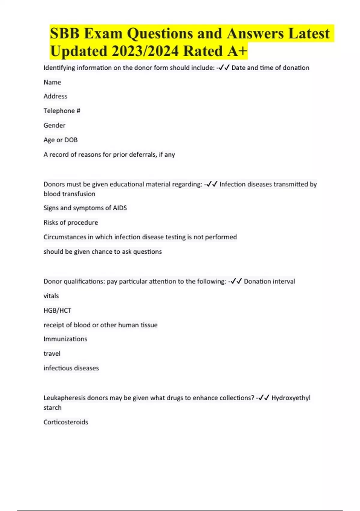 SBB Exam Practice Questions and Answers Latest Updated 2023/2024 | 100% Verified. Plasma manufacturers can use donors positive for what? - Anti-HBc Anti-HTLV-I/II Cytapheresis and Auto donors must be tested for ID how often - Every 30 days reactive ID results must be... - tested in duplicate for confirmation Neutralization: HBsAg and HIV-1 Ag Western Blot - Anti-HIV RIBA - Anti-HCV Anti-HTLV confirmed by repeating the test using another manufacturers EIA test HTLV testing and deferral - Two+ positives: 2 donations by same manufacturer = indefinite deferral 1+ by one manuf. and 1+ by another manuf = . 1+ by one manuf. and negative by another manuf. = 8 week deferral What does Dextrose in additive do for cells? - supports ATP generation What does Adenine in additive do for cells? - provides substrate for ATP synthesis What does sodium biphosphate in additive do for cells? - controls pH What does citrate in additive do for cells? - prevents coagulation What is the storage time if additive used is CPD, CP2D? - 21 days What is the storage time if additive used is CPDA-1? - 35 days What is the storage time if additive used is AS-1 (Adsol)? - 42 days What is the storage time if additive used is AS-3 (nutricel)? - 42 days What is the storage time if additive used is AS-5 (Optisol)? - 42 days Whole Blood storage temp and description - 1-6C contains all blood elements plus the anticoagulant-preservative commonly used as a source for component production RBC storage and description - 1-6C Whole blood with plasma removed RBCs without additives must have final hct <80% Frozen RBC storage and description - -65C or colder frozen within 6 days if no additive solution RBC w/additive must be frozen before expiration must be put in freezer within 4 hours of removed from 4C Rejuvenated RBC description - rejuvenation should restore 2,3-DPG to 75% of normal level and ATP above normal levels. If done before 14 days may cause high 2,3-DPG which impairs O2 up-take. AS-3 and AS-5 cannot be rejuvenated Deglyced RBCs storage and description - 37C warmer or waterbath (20-25 minutes) washed with solutions of decreasing osmolarity to avoid hemolysis. must remove cryoprotectant agents, minimial free hgb, and result in recovery of at least 80% RBC volume. open system:1-6C with 24 hr expiration. closed system: 14 days or as FDA approved What should the osmolality of a deglyced unit be? - <500. Osmolality is a fxn of free glycerol therefore an increase is a result of improper deglycing What should free hgb in last wash be from decglyed unit? - <200 Washed RBCs storage - 1-6C washed with sterile normal saline to remove most of plasma 24 hour expiration FFP storage and description - prepared from WB or collected using apheresis. frozen at -18C or below contains max levels of labile or nonlabile coag factors Thaw between 30-37C Thawed plasma - FFP thawed but not transfused within 24 hrs can be stored 1-6C for 5 days reduction in Factors V and VII Liquid plasma - plasma separated from WB at any time during storage, up to 5 days after the expiration date of WB. supernatant levels of potassium and ammonia are increased Cryo - prepared from WB collected into CPDA-1 or CPD precipitates when FFP thawed between 1-6C stored at -18C or colder suspended in less than 15mL plasma contains factor VII and fibrinogen and most of XIII single unit store at 20-24 for 6 hrs pooled store at 20-24 for 4 hours platelets - prepared from WB that hasn't cooled below 20C separated within 4 hours soft spin (plt rich plasma) followed by a hard spin (platelet concentrate) resuspended in about 45-65mL plasma 20-24C with gentle agitation Granulocytes - usually harvested in buffy coats collection must yield 1.0x10 to the 10th granulocytes Transfuse ASAP Irradiation - prevents proliferation of transfused T-Lymphs, the primary cause of graft vs host (GVHD) effects of storage on blood components - decreases 2,3-DPG levels: this controls release of O2 from RBCs, levels recover after 24 hrs post txn decreases ATP increases potassium Leukocyte reduction must reduce WBC count to what? - <5x10 to the sixth in at least 95% of units samples and yield >85% RBC recovery What must the minimum mean volume of Apheresis RBCs be? - 180mL packed RBC volume per unit (>60g hgb) 95% of samples units must have at least 150mL (>50g hgb) What must the minimum mean volume of Apheresis RBCs leukoreduced be? - <5x10 to the sixth WBC and mean volume of 153mL packed RBC volume per unit (>51g Hgb) 95% of sample units have at least 128mL (>42.5g hgb) How much coag factor VIII and fibrinogen must cryo have? - 80IU Factor VIII and 150mg fibrinogen pooled units must have same amt multipled by number of units in pool What are Mendel's principles? - random segregation: distinct genes are randomly inherited one from each parent what is independent assortmant (Mendel's principle)? - genes inherited independently if carried on different chromosomes. combos of genes are not dependent on other genes (exception: linkage) what is an autosome? - any chromosome other than the sex chromosomes What is meiosis? - process by which sex cells are produced which have only one copy of each chromosome (haploid). What is mitosis? - process where sex cells are duplicated and equally divided between two daughter cells zygote - fertilized egg gamete - sex cells....egg and sperm diploid - normal number of chromosomes in zygote and all body cells (46) haploid - normal number of chromosomes in all gametes (23) structural gene - gene that controls the protein production of another gene or genes regulator gene - gene that controls the rated of production of another gene or genes allele - alternate forms of a gene at a given locus locus - location of a gene on a chromosome linkage - two loci carried on the same chromosome and usually inheritied together. The closer the loci, the closer the linkage. Seen in Rh, MNS and HLA codominant - both expressed in heterozygous state. Ex: AB, Fy(a+b+) dominant - trait expressed in 