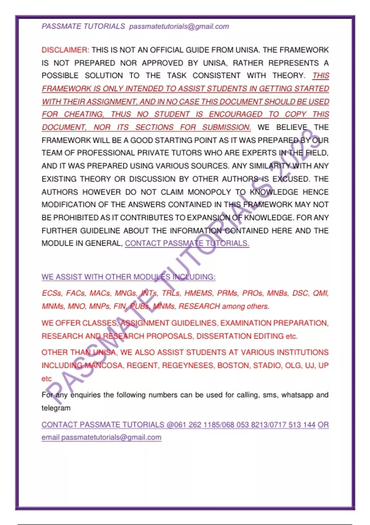 DISCLAIMER: THIS IS NOT AN OFFICIAL GUIDE FROM UNISA. THE FRAMEWORK