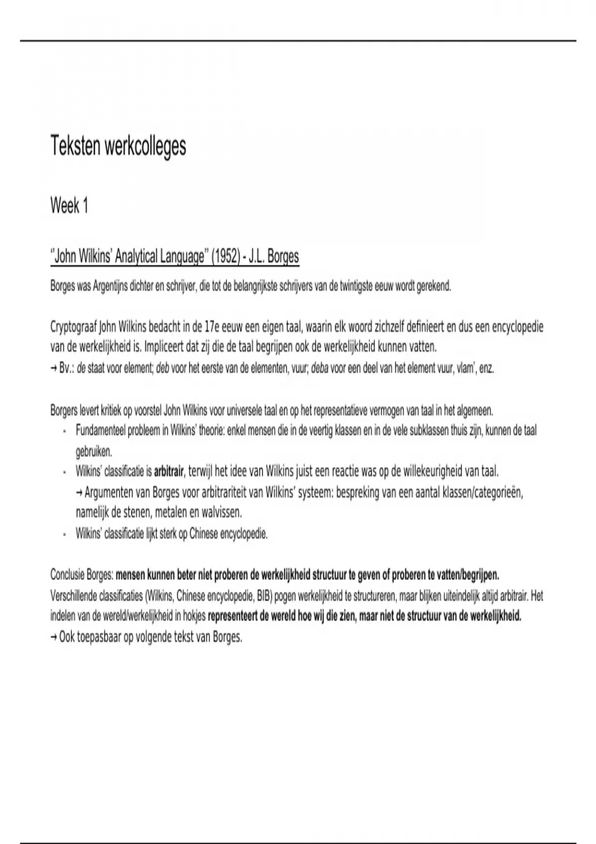 Borgers levert kritiek op voorstel John Wilkins voor universele taal en op het representatieve vermogen van taal in het algemeen.