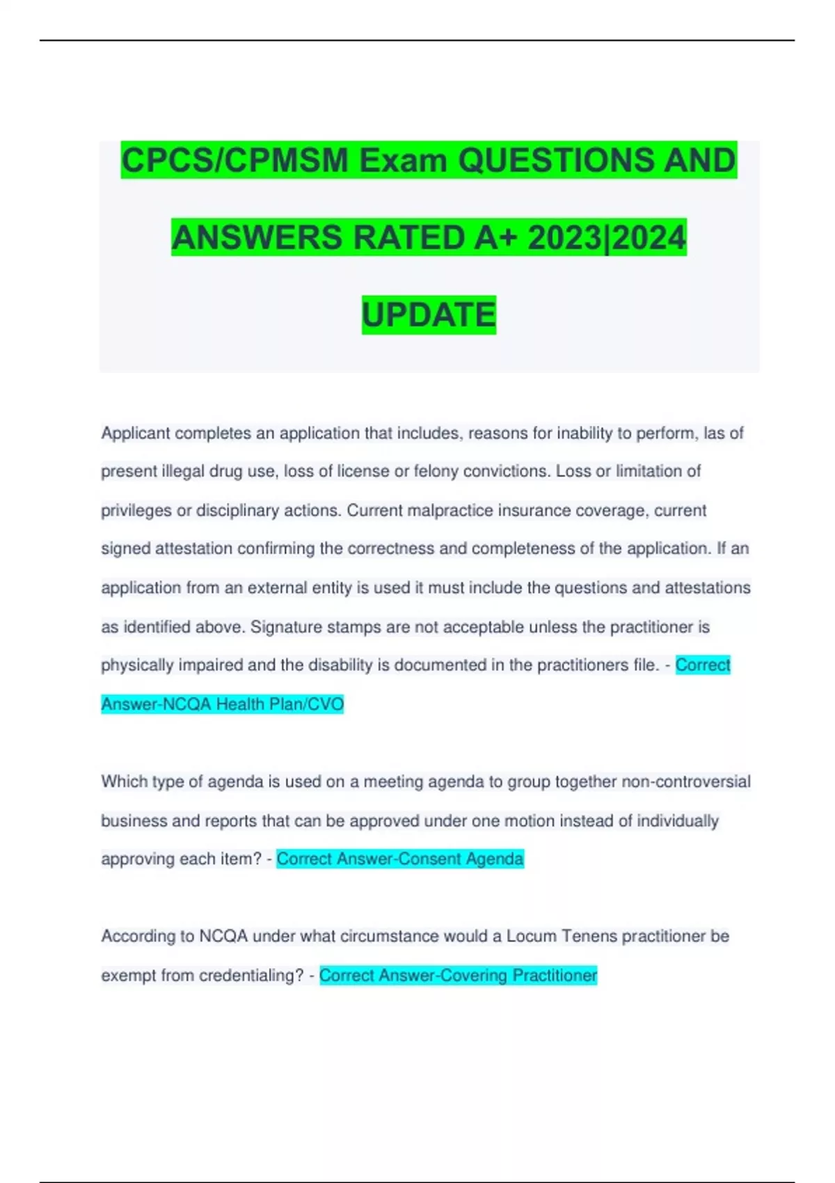 CPCS/CPMSM Exam QUESTIONS AND ANSWERS RATED A+ 2023|2024 UPDATE Applicant completes an application that includes, reasons for inability to perform, las of present illegal drug use, loss of license or felony convictions. Loss or limitation of privileges or disciplinary actions. Current malpractice insurance coverage, current signed attestation confirming the correctness and completeness of the application. If an application from an external entity is used it must include the questions and attestations as identified above. Signature stamps are not acceptable unless the practitioner is physically impaired and the disability is documented in the practitioners file. - Correct Answer-NCQA Health Plan/CVO Which type of agenda is used on a meeting agenda to group together non-controversial business and reports that can be approved under one motion instead of individually approving each item? - Correct Answer-Consent Agenda According to NCQA under what circumstance would a Locum Tenens practitioner be exempt from credentialing? - Correct Answer-Covering Practitioner According to URAC, when developing a quality auditing process, prudent practice would be to audit what percentage of completed credentialing files? - Correct Answer- According to URAC, a complete credentials file should be reviewed by which professionals? - Correct Answer- According to NCQA, what must be included in the organization's right to appeal policies? - Correct Answer-written notification when a professional review action has been brought against a practitioner reasons for the action summary of the appeal rights and process ability to request a hearing and the specific time period for submitting the request allowing for at least 30 calendar days after the notification for practitioners to request a hearing allowing representation by an attorney or another person appointment of a hearing officer or a panel of individuals to review the appeal and written notification of the appeal decision that contains specific reasons for the decision
