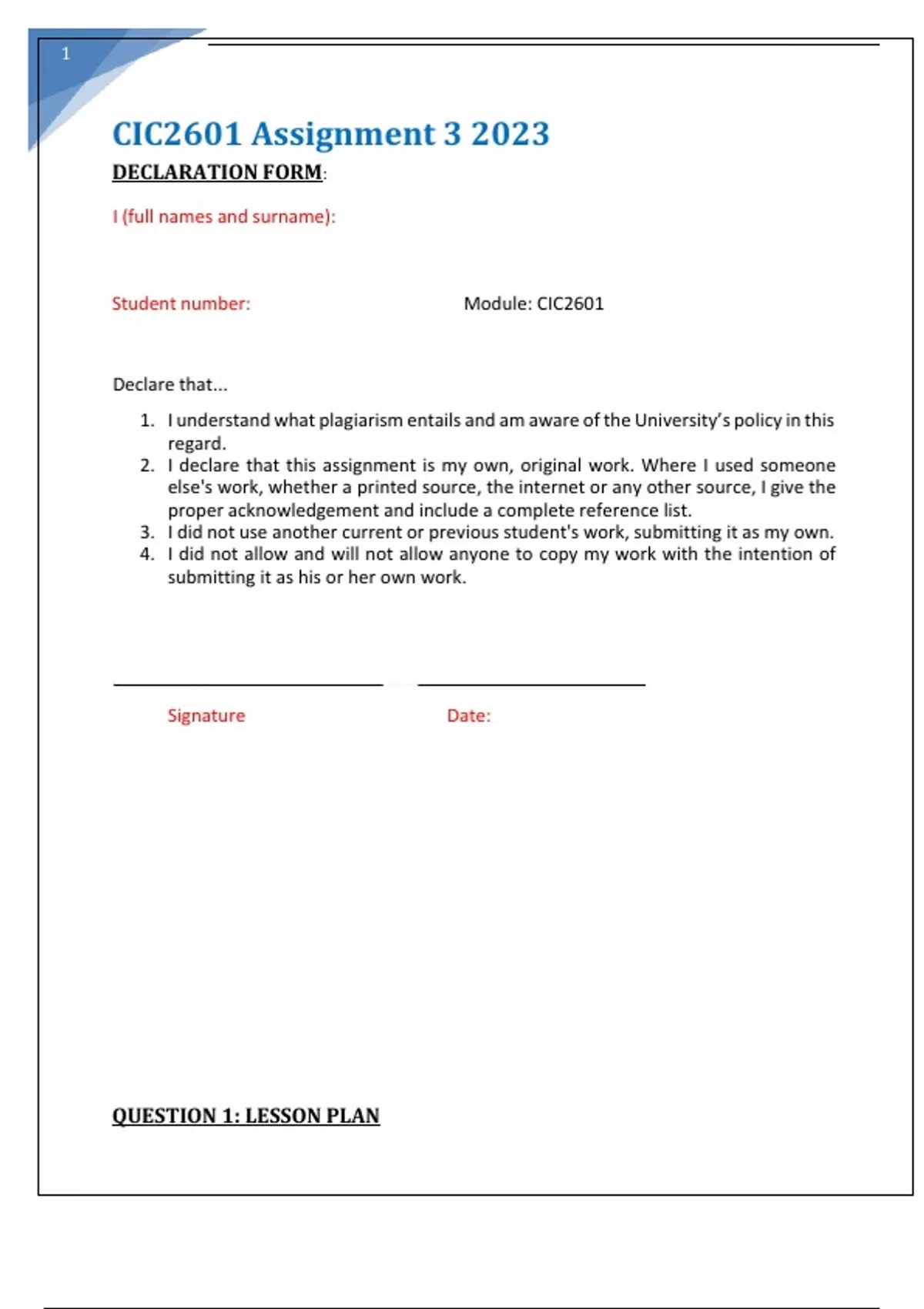 1. I understand what plagiarism entails and am aware of the University’s policy in this
