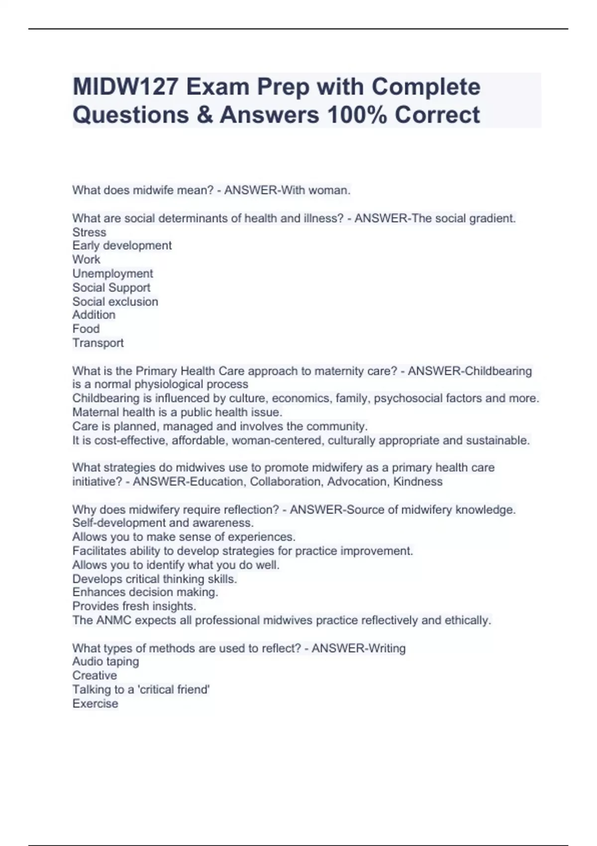 What does midwife mean? - ANSWER-With woman. What are social determinants of health and illness? - ANSWER-The social gradient. Stress Early development Work Unemployment Social Support Social exclusion Addition Food Transport What is the Primary Health Care approach to maternity care? - ANSWER-Childbearing is a normal physiological process Childbearing is influenced by culture, economics, family, psychosocial factors and more. Maternal health is a public health issue. Care is planned, managed and involves the community. It is cost-effective, affordable, woman-centered, culturally appropriate and sustainable. What strategies do midwives use to promote midwifery as a primary health care initiative? - ANSWER-Education, Collaboration, Advocation, Kindness Why does midwifery require reflection? - ANSWER-Source of midwifery knowledge. Self-development and awareness. Allows you to make sense of experiences. Facilitates ability to develop strategies for practice improvement. Allows you to identify what you do well. Develops critical thinking skills. Enhances decision making. Provides fresh insights. The ANMC expects all professional midwives practice reflectively and ethically. What types of methods are used to reflect? - ANSWER-Writing Audio taping Creative Talking to a 'critical friend' Exercise Meditation Name types of Reflection. - ANSWER-Technical Practical Emancipatory. Describe technical reflection. - ANSWER-- useful for change in practice procedures and routines. - based on theories of scientific reasoning. Describe practical reflection. - ANSWER-- Useful for examining the 'lived experience' - based on interpretative theory (narrative inquiry) Describe emancipatory reflection. - ANSWER-- useful in situations where power struggles are present. - based on critical theory. Aims to empower people through creating ' transformative action' Name two models of reflection. - ANSWER-Gibbs Schlater & Minocha describe the Gibbs cycle? - ANSWER-Description - What happened? Feelings - What were you thinking and feeling? Evaluation - what was good and bad about the experience. Analysis - what sense can you make of the situation. Conclusion - what else could you have done. Action Plan - if it arose, what would you do? Describe Schlater and Minocha reflective cycle. - ANSWER-Basic Reflection. Observe. Notice effects. Report self awareness. Identify own position. Improve. Deeper Reflection. Observe - contextualize . Notice effects - Identify causes. Report self awareness - relate to practice. Identify own position - connect to theory. Improve - Justify changes. Describe Ethical midwifery practice. - ANSWER-Is safe and effective. Is respectful and kind to self and others. values each persons unique individuality, through cultural safety principles. Is MIDW127 Exam Prep with Complete Questions & Answers 100% Correct