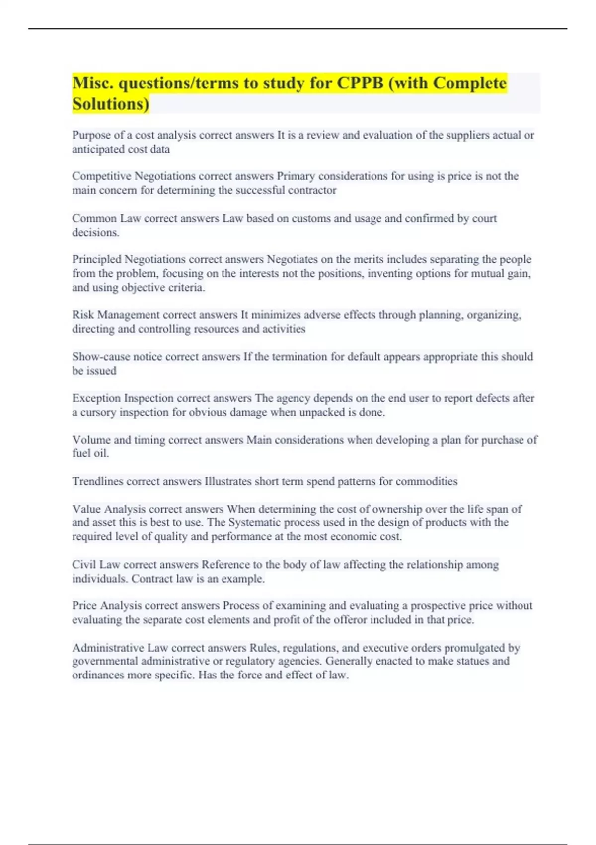 Purpose of a cost analysis correct answers It is a review and evaluation of the suppliers actual or anticipated cost data Competitive Negotiations correct answers Primary considerations for using is price is not the main concern for determining the successful contractor Common Law correct answers Law based on customs and usage and confirmed by court decisions. Principled Negotiations correct answers Negotiates on the merits includes separating the people from the problem, focusing on the interests not the positions, inventing options for mutual gain, and using objective criteria. Risk Management correct answers It minimizes adverse effects through planning, organizing, directing and controlling resources and activities Show-cause notice correct answers If the termination for default appears appropriate this should be issued Exception Inspection correct answers The agency depends on the end user to report defects after a cursory inspection for obvious damage when unpacked is done. Volume and timing correct answers Main considerations when developing a plan for purchase of fuel oil. Trendlines correct answers Illustrates short term spend patterns for commodities Value Analysis correct answers When determining the cost of ownership over the life span of and asset this is best to use. The Systematic process used in the design of products with the required level of quality and performance at the most economic cost. Civil Law correct answers Reference to the body of law affecting the relationship among individuals. Contract law is an example. Price Analysis correct answers Process of examining and evaluating a prospective price without evaluating the separate cost elements and profit of the offeror included in that price. Administrative Law correct answers Rules, regulations, and executive orders promulgated by governmental administrative or regulatory agencies. Generally enacted to make statues and ordinances more specific. Has the force and effect of law.