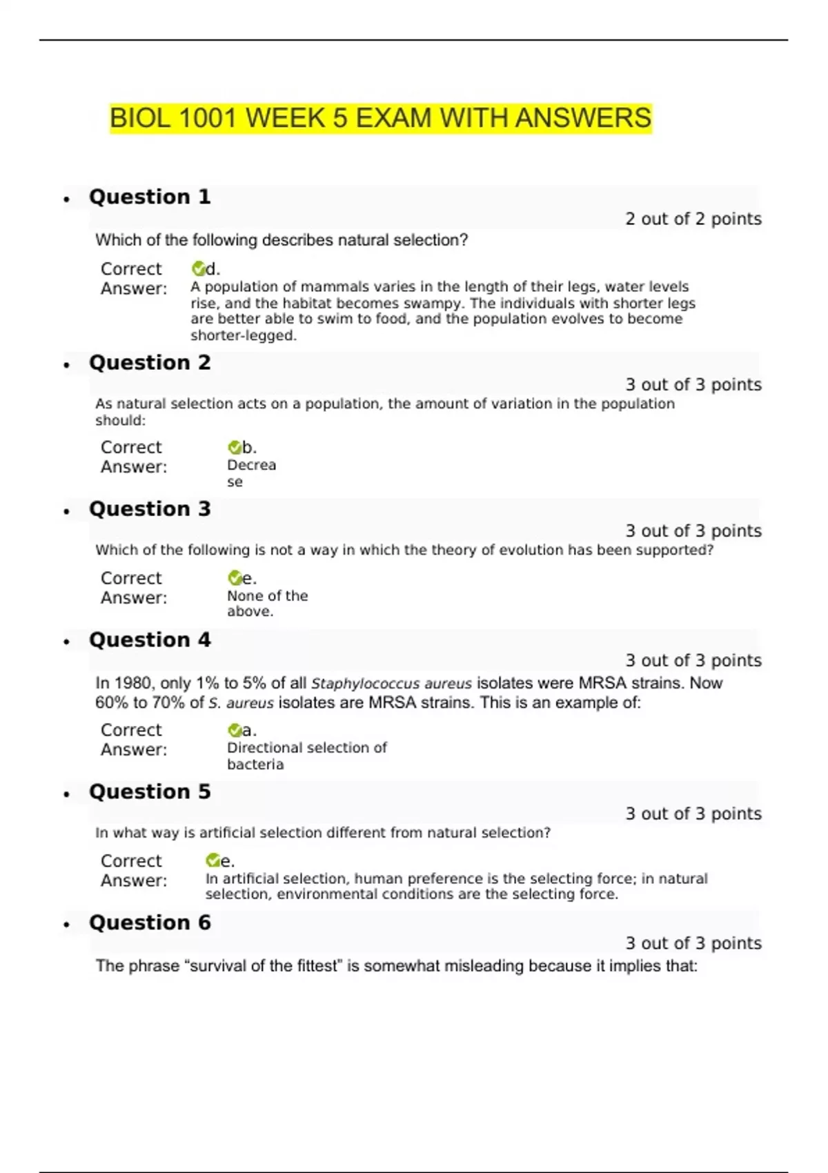 BIOL 1001 WEEK 5 EXAM WITH ANSWERS • Question 1 2 out of 2 points Which of the following describes natural selection? Correct Answer: d. A population of mammals varies in the length of their legs, water levels rise, and the habitat becomes swampy. The individuals with shorter legs are better able to swim to food, and the population evolves to become shorter-legged. • Question 2 3 out of 3 points As natural selection acts on a population, the amount of variation in the population should: Correct Answer: b. Decrease • Question 3 3 out of 3 points Which of the following is not a way in which the theory of evolution has been supported? Correct Answer: e. None of the above. • Question 4 3 out of 3 points In 1980, only 1% to 5% of all Staphylococcus aureus isolates were MRSA strains. Now 60% to 70% of S. aureus isolates are MRSA strains. This is an example of: Correct Answer: a. Directional selection of bacteria