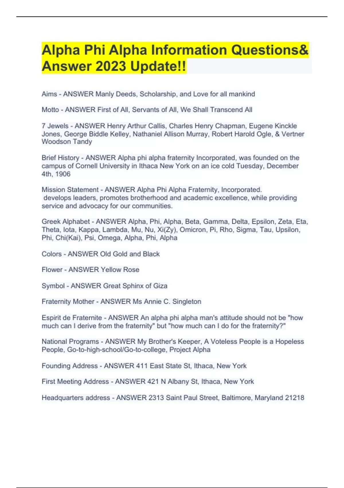 Aims - ANSWER Manly Deeds, Scholarship, and Love for all mankind Motto - ANSWER First of All, Servants of All, We Shall Transcend All 7 Jewels - ANSWER Henry Arthur Callis, Charles Henry Chapman, Eugene Kinckle Jones, George Biddle Kelley, Nathaniel Allison Murray, Robert Harold Ogle, & Vertner Woodson Tandy Brief History - ANSWER Alpha phi alpha fraternity Incorporated, was founded on the campus of Cornell University in Ithaca New York on an ice cold Tuesday, December 4th, 1906 Mission Statement - ANSWER Alpha Phi Alpha Fraternity, Incorporated. develops leaders, promotes brotherhood and academic excellence, while providing service and advocacy for our communities. Greek Alphabet - ANSWER Alpha, Phi, Alpha, Beta, Gamma, Delta, Epsilon, Zeta, Eta, Theta, Iota, Kappa, Lambda, Mu, Nu, Xi(Zy), Omicron, Pi, Rho, Sigma, Tau, Upsilon, Phi, Chi(Kai), Psi, Omega, Alpha, Phi, Alpha Colors - ANSWER Old Gold and Black Flower - ANSWER Yellow Rose Symbol - ANSWER Great Sphinx of Giza Fraternity Mother - ANSWER Ms Annie C. Singleton Espirit de Fraternite - ANSWER An alpha phi alpha man's attitude should not be "how much can I derive from the fraternity" but "how much can I do for the fraternity?" National Programs - ANSWER My Brother's Keeper, A Voteless People is a Hopeless People, Go-to-high-school/Go-to-college, Project Alpha Founding Address - ANSWER 411 East State St, Ithaca, New York First Meeting Address - ANSWER 421 N Albany St, Ithaca, New York Headquarters address - ANSWER 2313 Saint Paul Street, Baltimore, Maryland 21218 7Ps - ANSWER Proper Prior Preparation Prevents Piss Poor Performance Excuses - ANSWER Excuses are monuments of nothing: they build bridges that lead to nowhere. And those who use these tools of incompetence are masters of nothing. Therefore we do not use excuses. Objectives - ANSWER to stimulate the ambition of its members; to prepare them for the greatest usefulness in the causes of humanity, freeAlpha Phi Alpha Information Questions& Answer 2023 Update!!