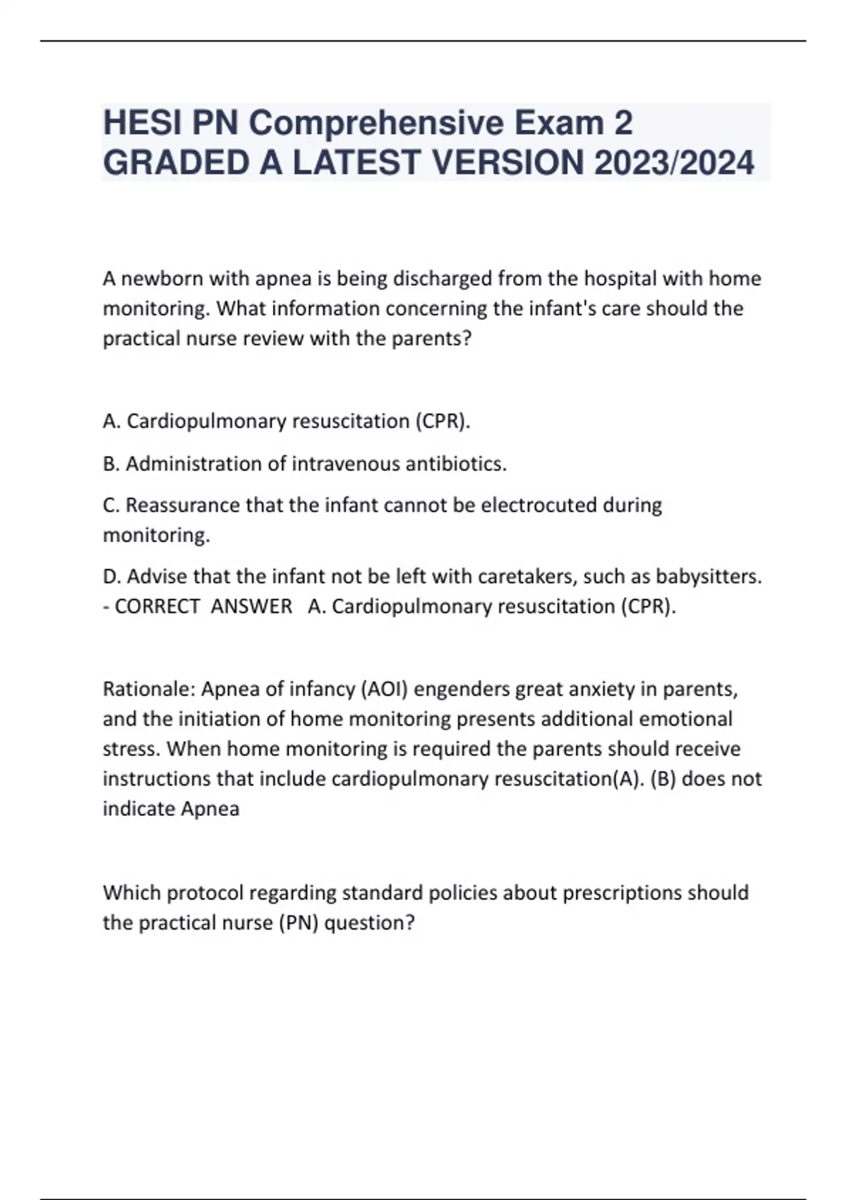 HESI PN Comprehensive Exam 2 GRADED A LATEST VERSION 2023/2024 A newborn with apnea is being discharged from the hospital with home monitoring. What information concerning the infant's care should the practical nurse review with the parents? A. Cardiopulmonary resuscitation (CPR). B. Administration of intravenous antibiotics. C. Reassurance that the infant cannot be electrocuted during monitoring. D. Advise that the infant not be left with caretakers, such as babysitters. - CORRECT ANSWER A. Cardiopulmonary resuscitation (CPR). Rationale: Apnea of infancy (AOI) engenders great anxiety in parents, and the initiation of home monitoring presents additional emotional stress. When home monitoring is required the parents should receive instructions that include cardiopulmonary resuscitation(A). (B) does not indicate Apnea Which protocol regarding standard policies about prescriptions should the practical nurse (PN) question
