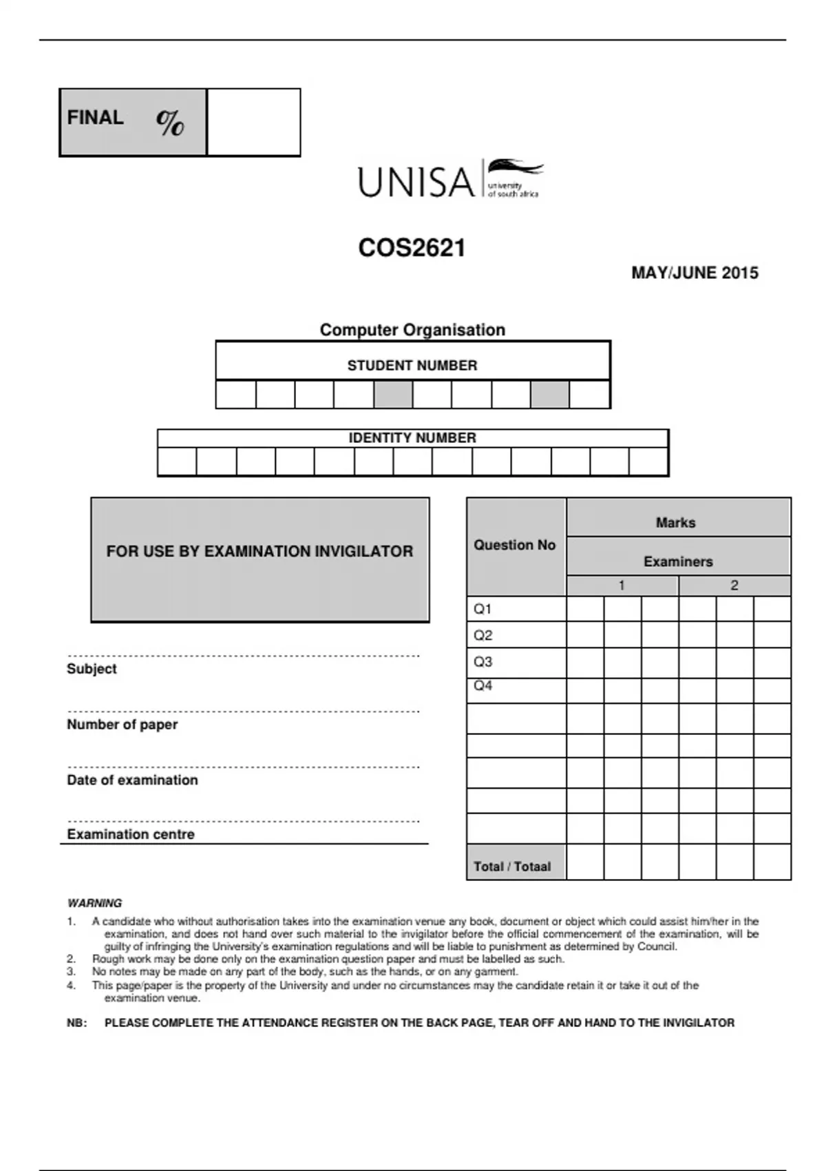 FOR USE BY EXAMINATION INVIGILATOR Question No