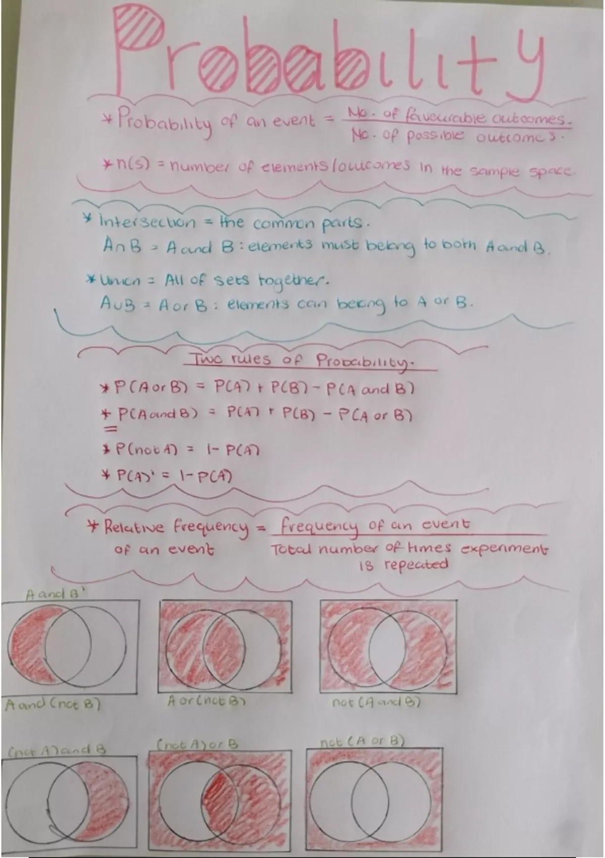 A South African curriculum mathematics set of notes. Finance and Growth, Measurement, and Probability. Simple notes written in different sets of colour for easier understanding. Finance and Growth has simple and compound interest formulae, as well as what they fall under. Measurement has a tables with area and perimeter of 5 basic shapes, and a table of volume and surface area of 8 different shapes. Probability has a simplified version of the basic formulae and Venn diagrams.