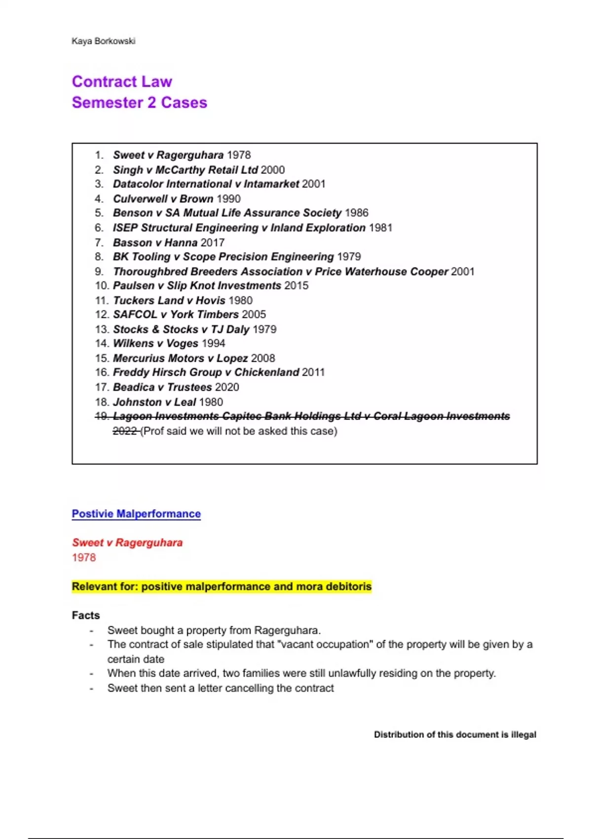 all prescribed semester 2 cases (stating the fact, issue, outcome and extra remarks as well as what the textbook contains on the cases) Sweet v Ragerguhara 1978 Singh v McCarthy Retail Ltd 2000 Datacolor International v Intamarket 2001 Culverwell v Brown 1990 Benson v SA Mutual Life Assurance Society 1986 ISEP Structural Engineering v Inland Exploration 1981 Basson v Hanna 2017 BK Tooling v Scope Precision Engineering 1979 Thoroughbred Breeders Association v Price Waterhouse Cooper 2001 Paulsen v Slip Knot Investments 2015 Tuckers Land v Hovis 1980 SAFCOL v York Timbers 2005 Stocks & Stocks v TJ Daly 1979 Wilkens v Voges 1994 Mercurius Motors v Lopez 2008 Freddy Hirsch Group v Chickenland 2011 Beadica v Trustees 2020 Johnston v Leal 1980