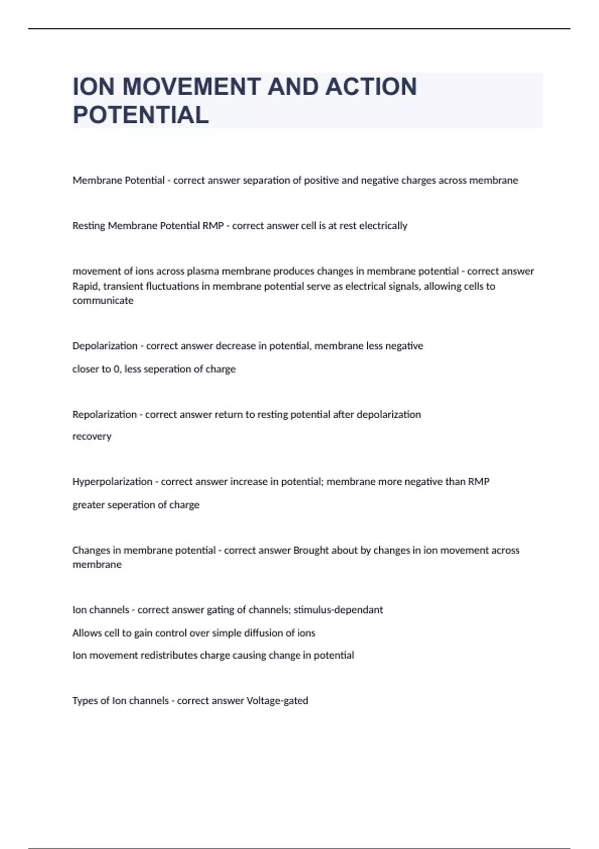 ION MOVEMENT AND ACTION POTENTIALMembrane Potential - correct answer separation of positive and negative charges across membrane Resting Membrane Potential RMP - correct answer cell is at rest electrically movement of ions across plasma membrane produces changes in membrane potential - correct answer Rapid, transient fluctuations in membrane potential serve as electrical signals, allowing cells to communicate Depolarization - correct answer decrease in potential, membrane less negative closer to 0, less seperation of charge Repolarization - correct answer return to resting potential after depolarization recovery Hyperpolarization - correct answer increase in potential; membrane more negative than RMP greater seperation of charge Changes in membrane potential - correct answer Brought about by changes in ion movement across membrane Ion channels - correct answer gating of channels; stimulus-dependant Allows cell to gain control over simple diffusion of ions Ion movement redistributes charge causing change in potential Types of Ion channels - correct answer Voltage-gated ligand-gated stretch-activated leak Main criteria for classifying channels is the mechanism of gating Voltage- gated channels - correct answer respond to change in voltage very selective Ligand-gated channels - correct answer norepinephrine, acetylcholine a ligand must bind before the channel can be open Stretch-activated - correct answer these channels are opened to due stretch mechanisms Leak channels - correct answer Na/ K channels always open Always leak Ion current flow - correct answer OHM's Law- describes ionic current flow across the membrane for a particular ion: I= (Vm - Eion)/ R Vm= Membrane potential Eion= Equilibrium potential Higher resistance, lower current OHM's Law Conductance (g) - correct answer 1/ R; proportional to membrane permeability, how many channels are open/ closed Iion = gion (Vm - Eion) Ohm's Law vs Fick's Law - correct answer Ion current Flow across membrane: Iion = gion (Vm - Eion) Diffusion of nonelectrolyte across membrane: J = Ps ([S]o - [S]i) Conductance for an ion (gion) is similar to pereability coeff for a solute Ps Driving force for an ion (Vm - Eion) is similar to delta[S] for solute