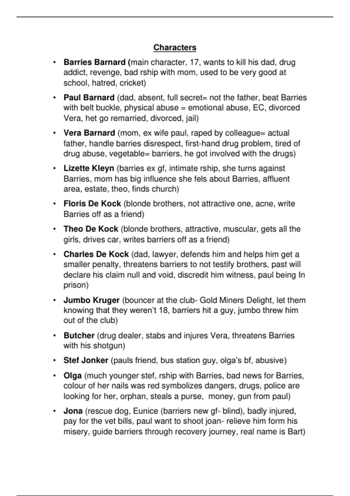 • Barries Barnard (main character, 17, wants to kill his dad, drug